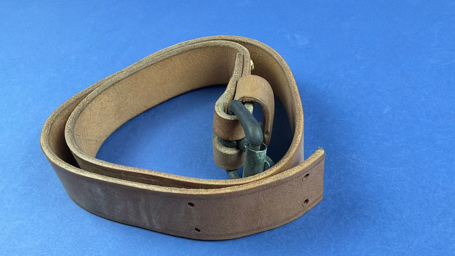 The strap itself is constructed from brown leather and fitted with an adjustable series of punched holes, along with a metal hook and loop arrangement designed to attach securely to equipment fittings. This type of strap would have allowed Signal Corps personnel to carry or sling their equipment more easily in the field, making it a practical and necessary accessory rather than a decorative item.