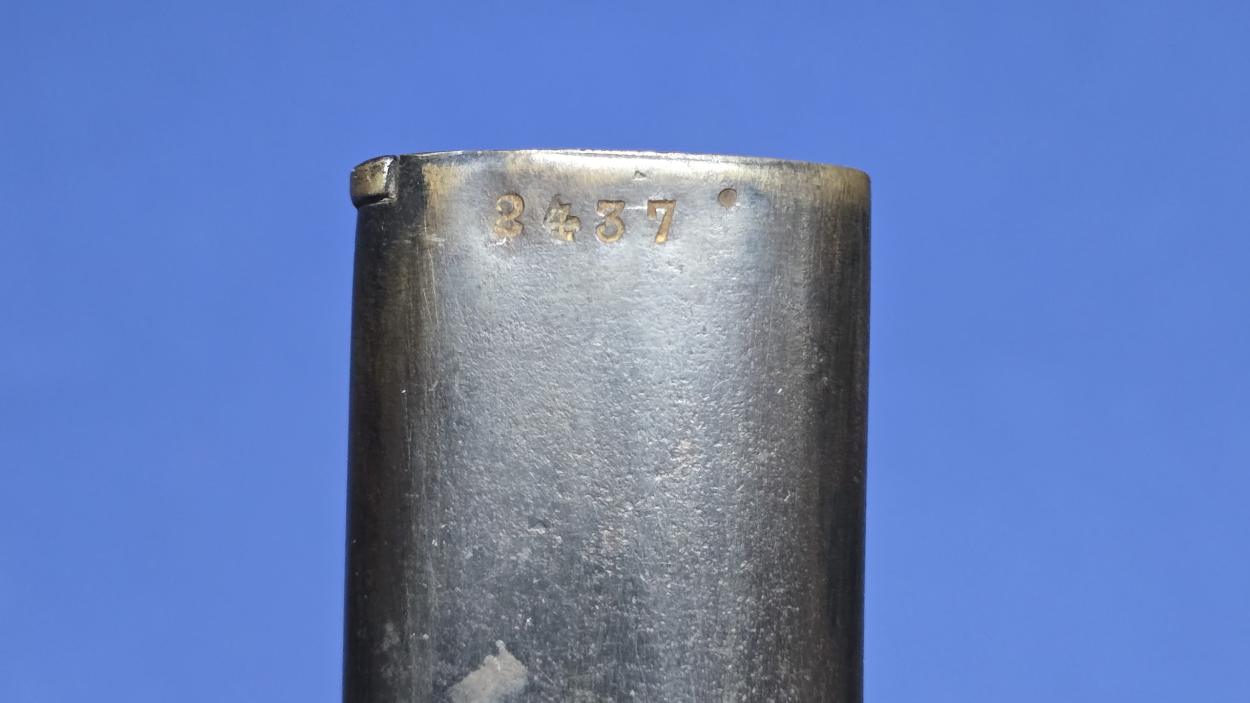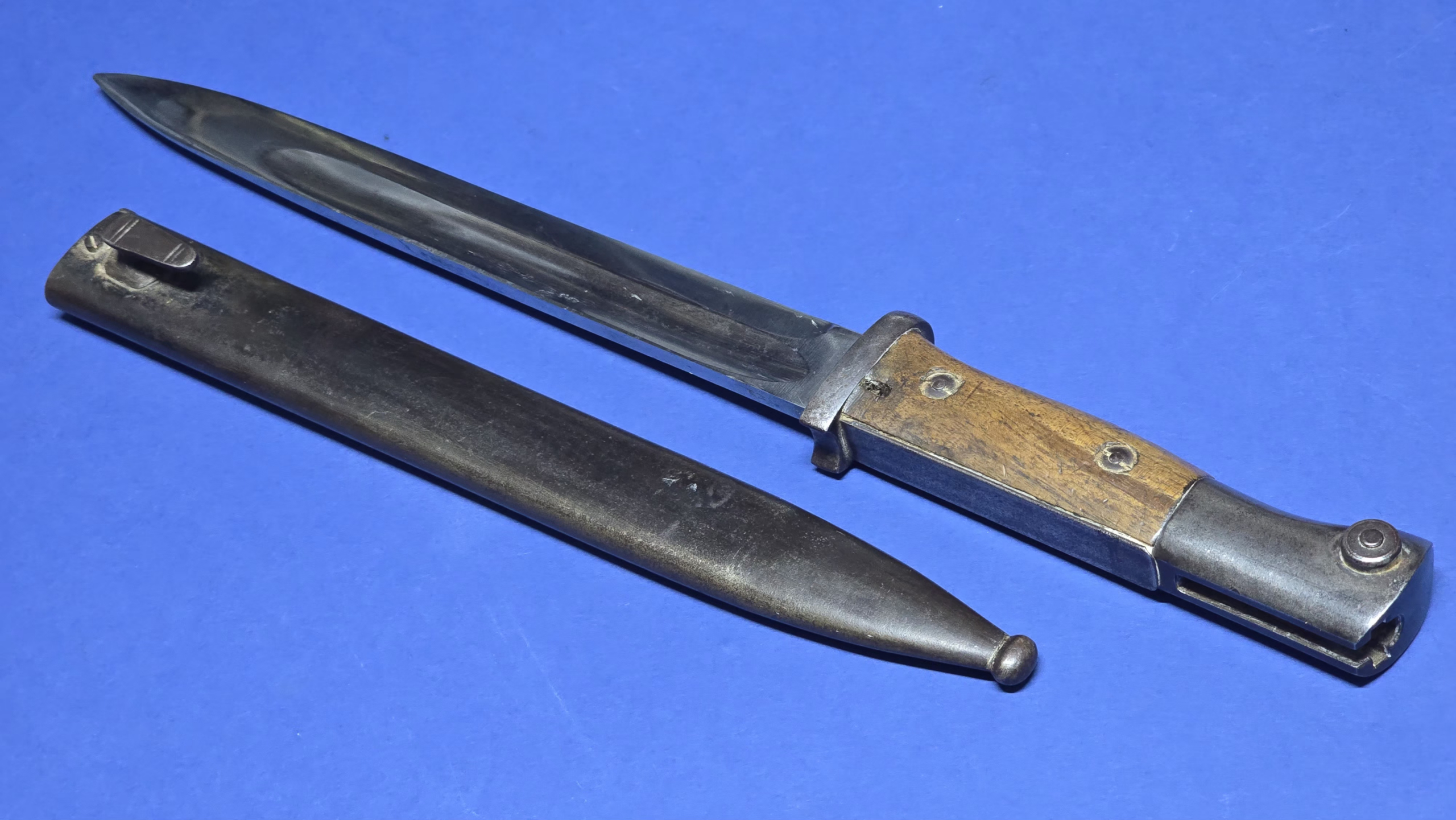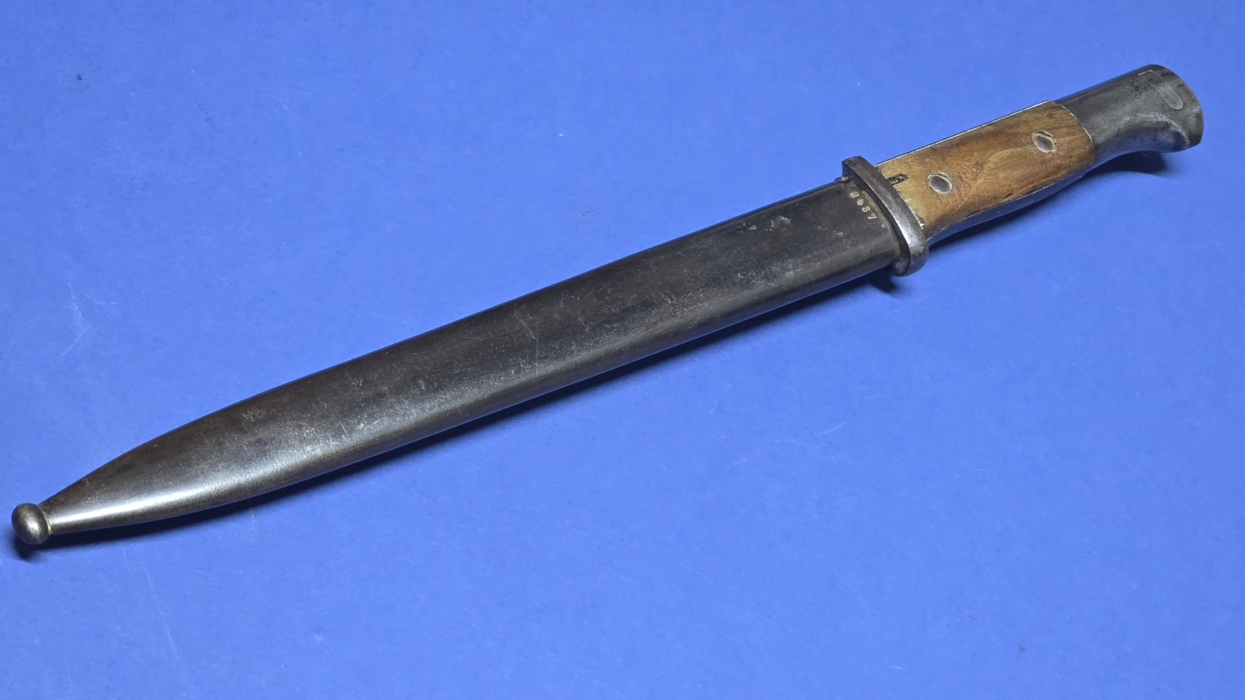 The bayonet is accompanied by its correct steel scabbard which remains in excellent condition for a First World War example. The scabbard retains a pleasing period finish with no dents or damage, with the throat screw being present. On the rear of the scabbard the serial number 2437 is stamped, matching the blade. This is not a marking style normally encountered on these bayonets, though the photographs clearly show it to be a genuine period stamping, adding an interesting talking point to the piece. The bayonet sits snugly in the scabbard with a good, secure fit.