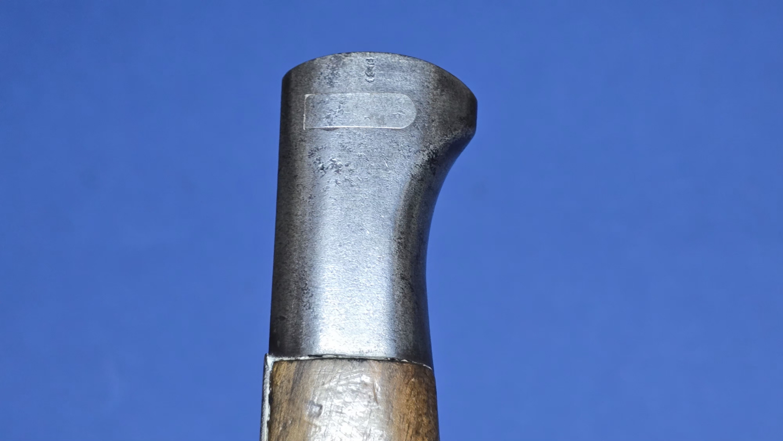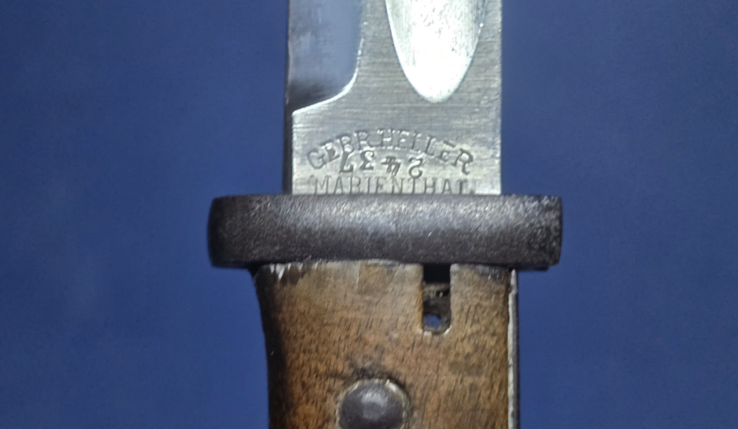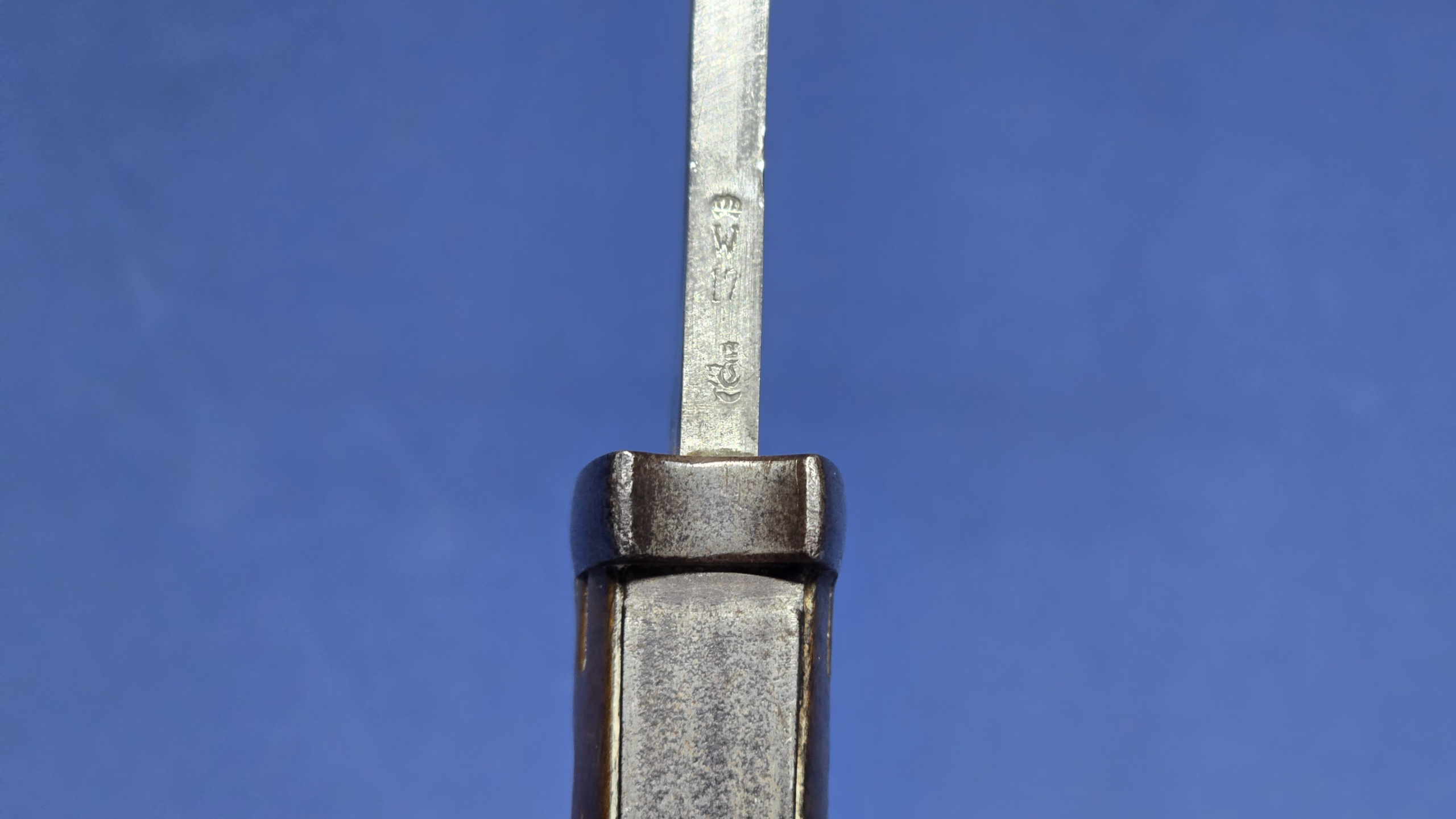 The blade remains in very pleasing condition for a WWI example. It is clean and bright showing minor service wear. The edge has been period sharpened, which has since softened over time, but shows no signs of post war sharpening abuse. The ricasso is clearly marked Gerbr. Heller, Marienthal, with the serial number 2437 stamped. The spine carries the imperial crown over W with the date 17, indicating 1917 manufacture, along with an inspection stamp.