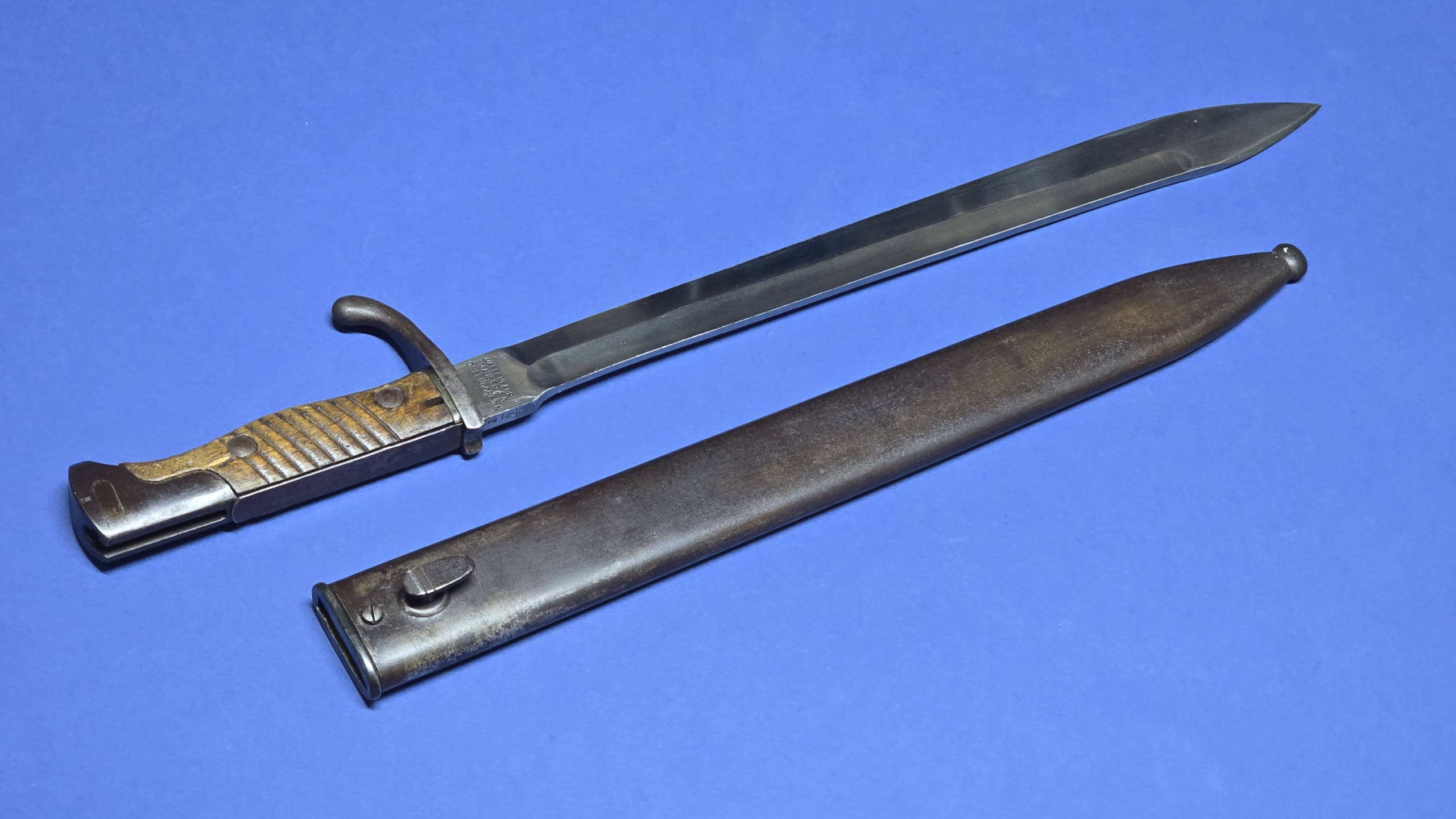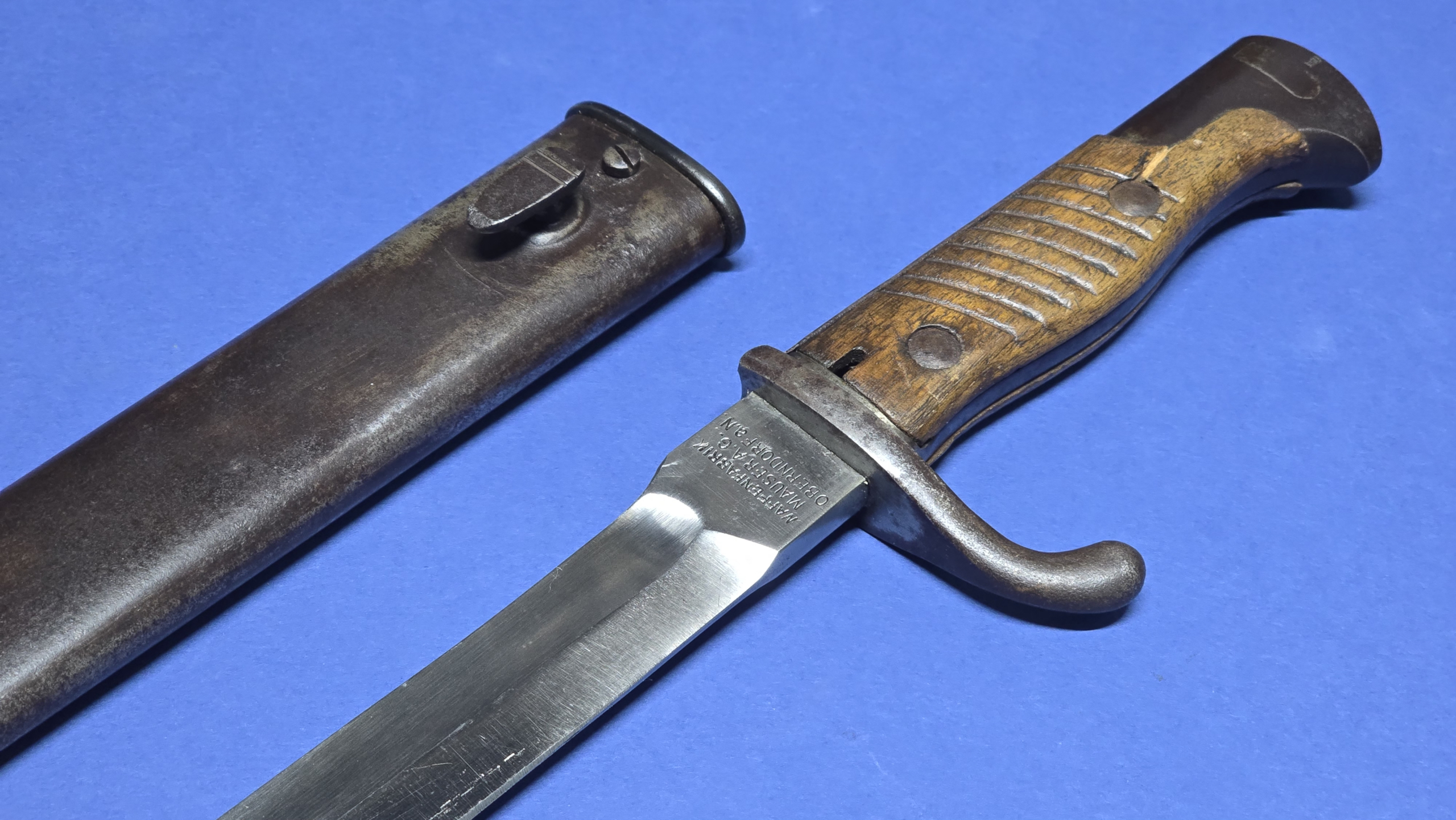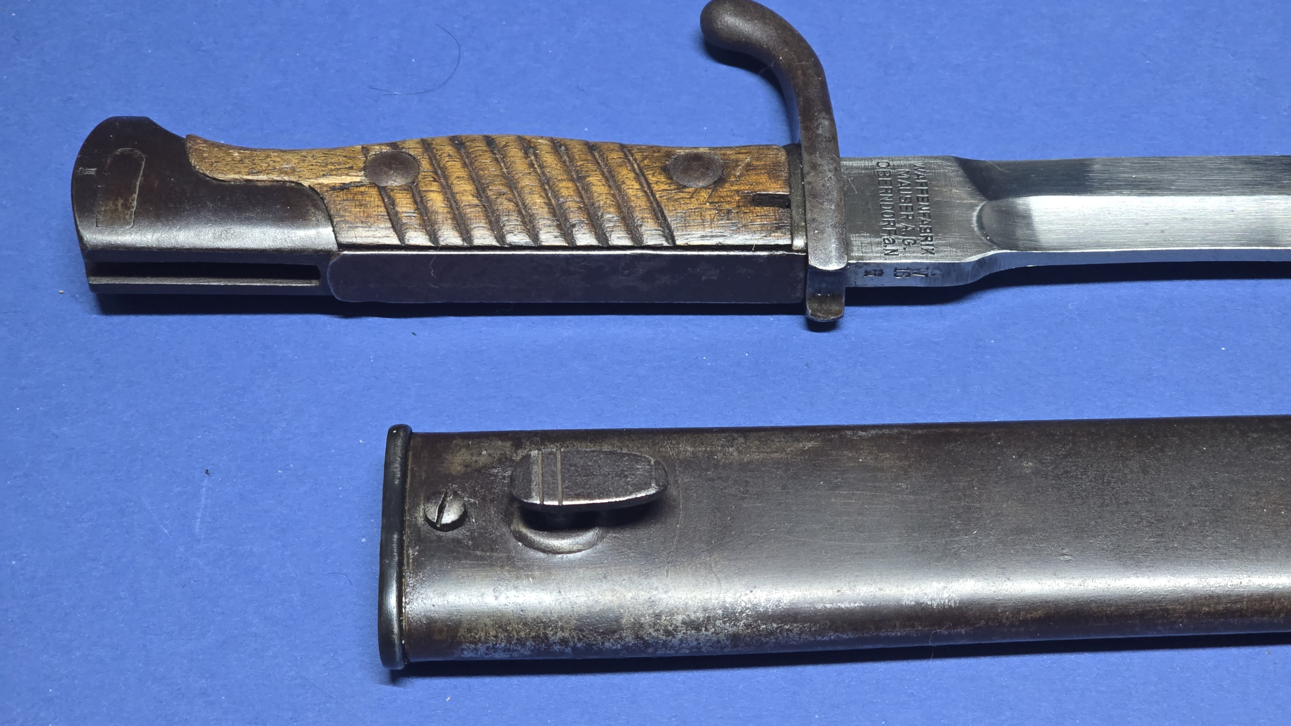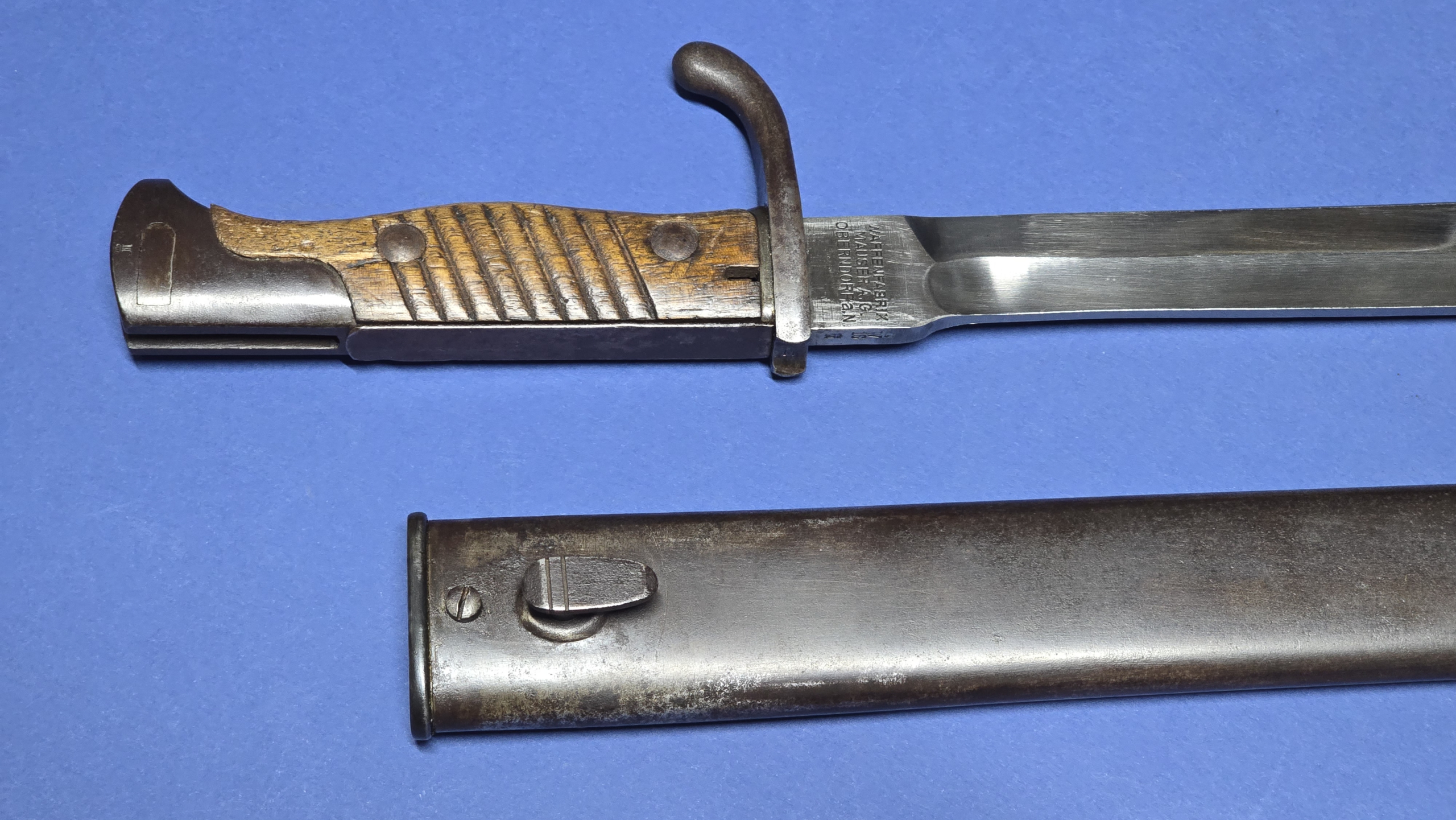 The scabbard is in excellent condition, that remains straight and structurally sound. There is the smallest faint indentation to the rear — subtle enough to be difficult to see, but just about detectable by hand. The original scabbard throat screw is present, with the rear of the scabbard being maker marked Waffenfabrik Mauser A.G. Oberndorf, giving a matching maker to the blade.
