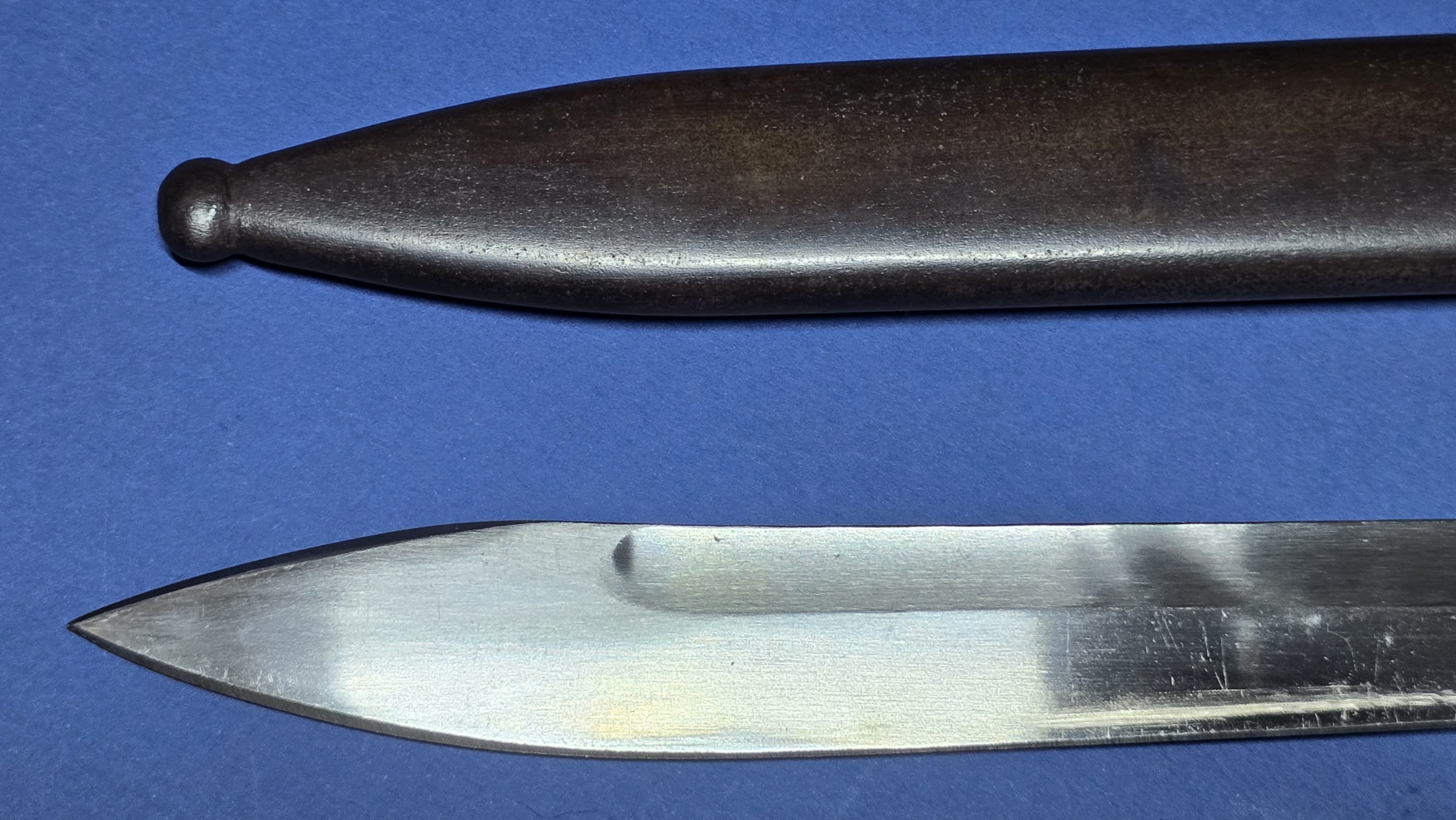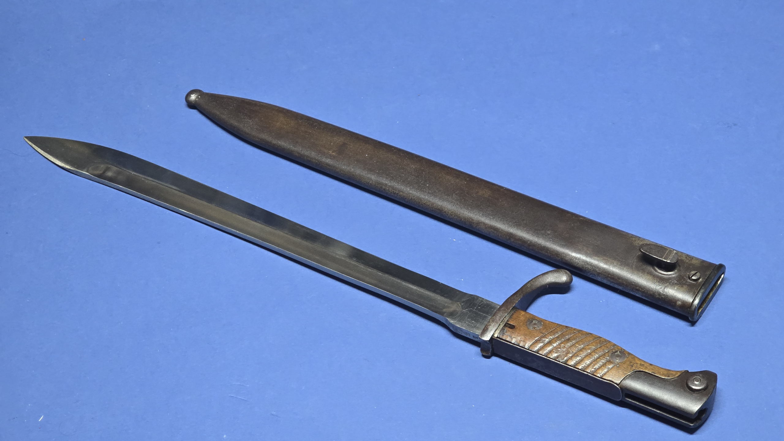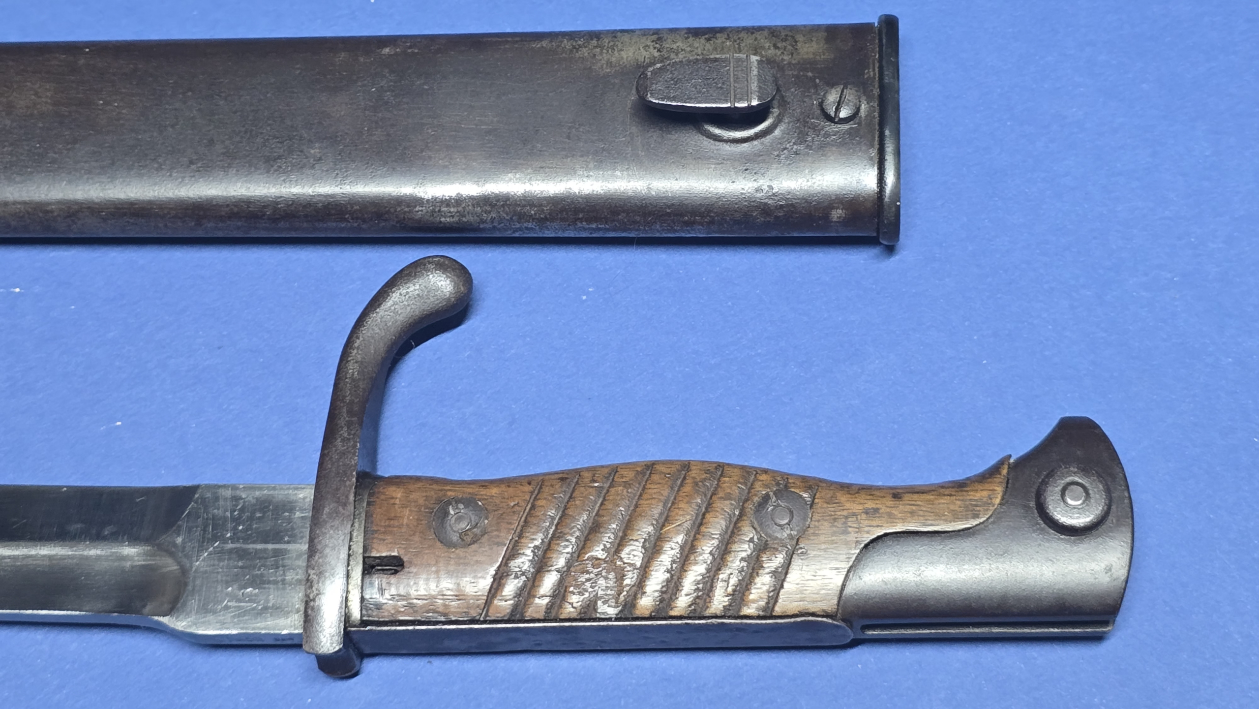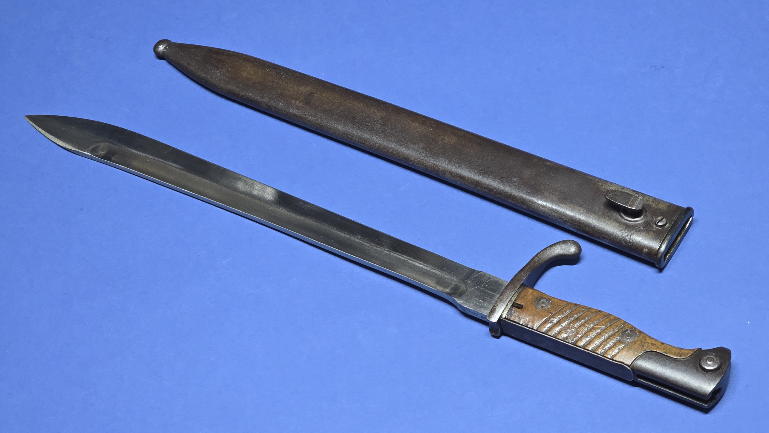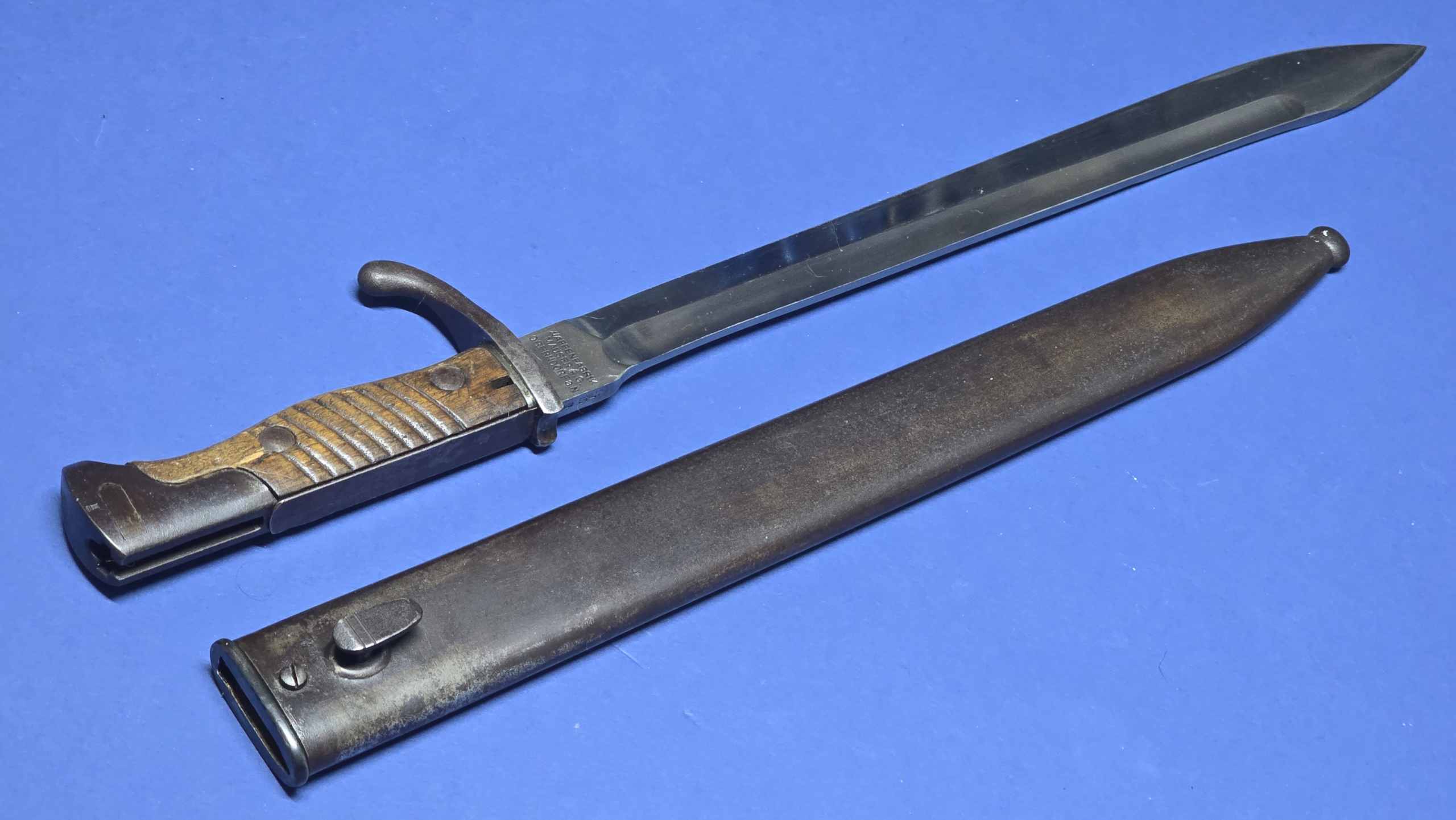 The scabbard is in excellent condition, that remains straight and structurally sound. There is the smallest faint indentation to the rear — subtle enough to be difficult to see, but just about detectable by hand. The original scabbard throat screw is present, with the rear of the scabbard being maker marked Waffenfabrik Mauser A.G. Oberndorf, giving a matching maker to the blade.