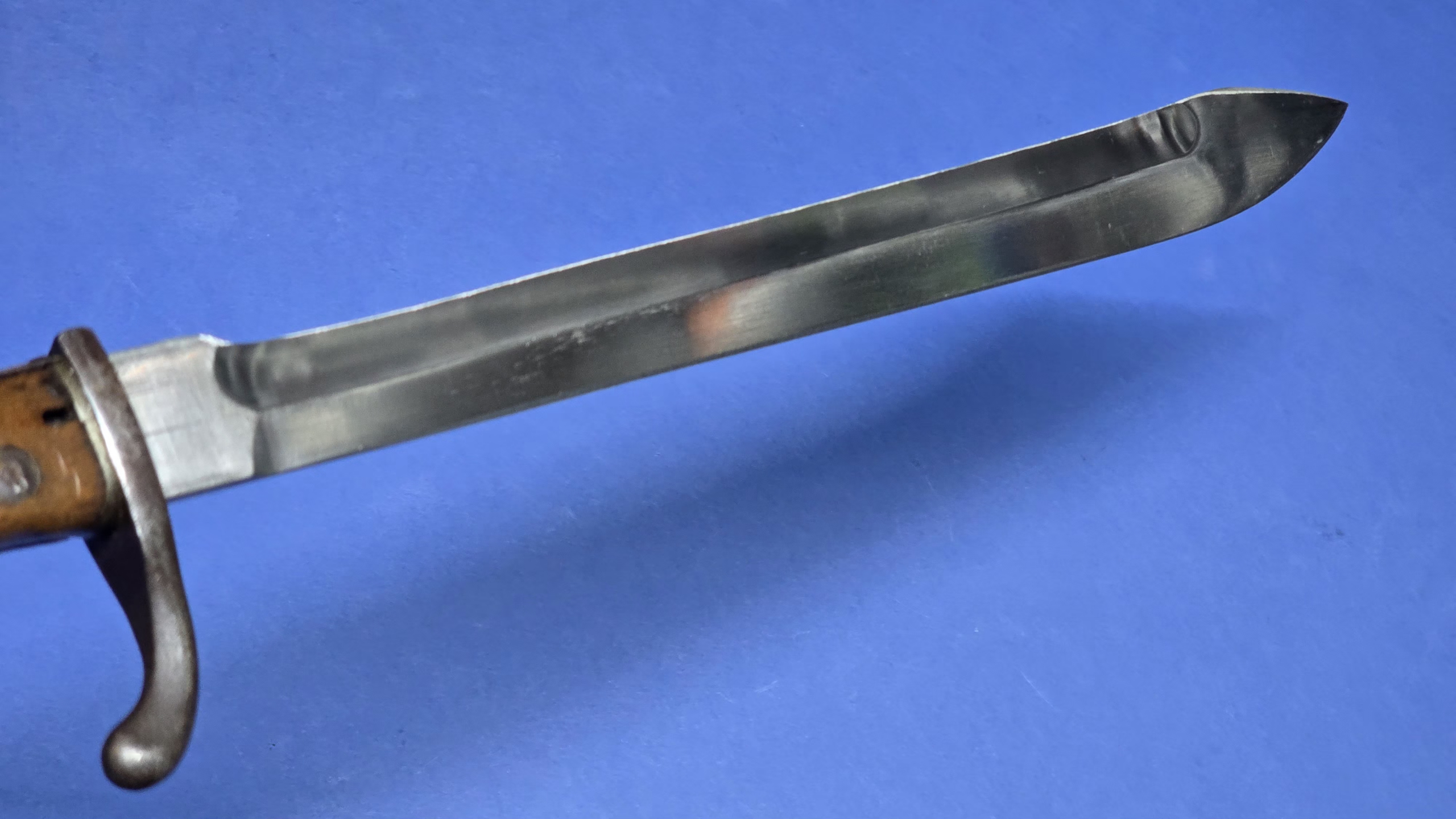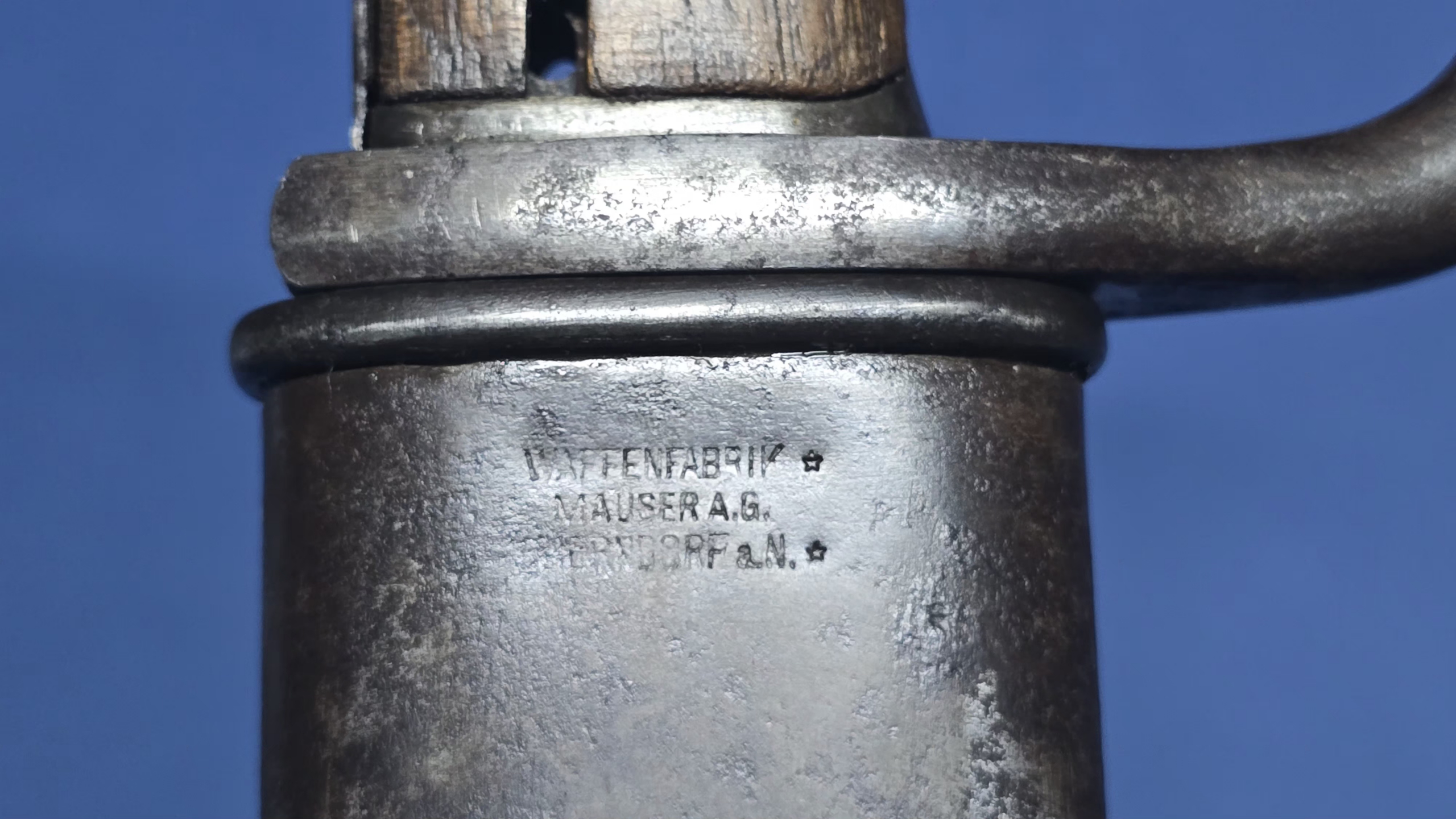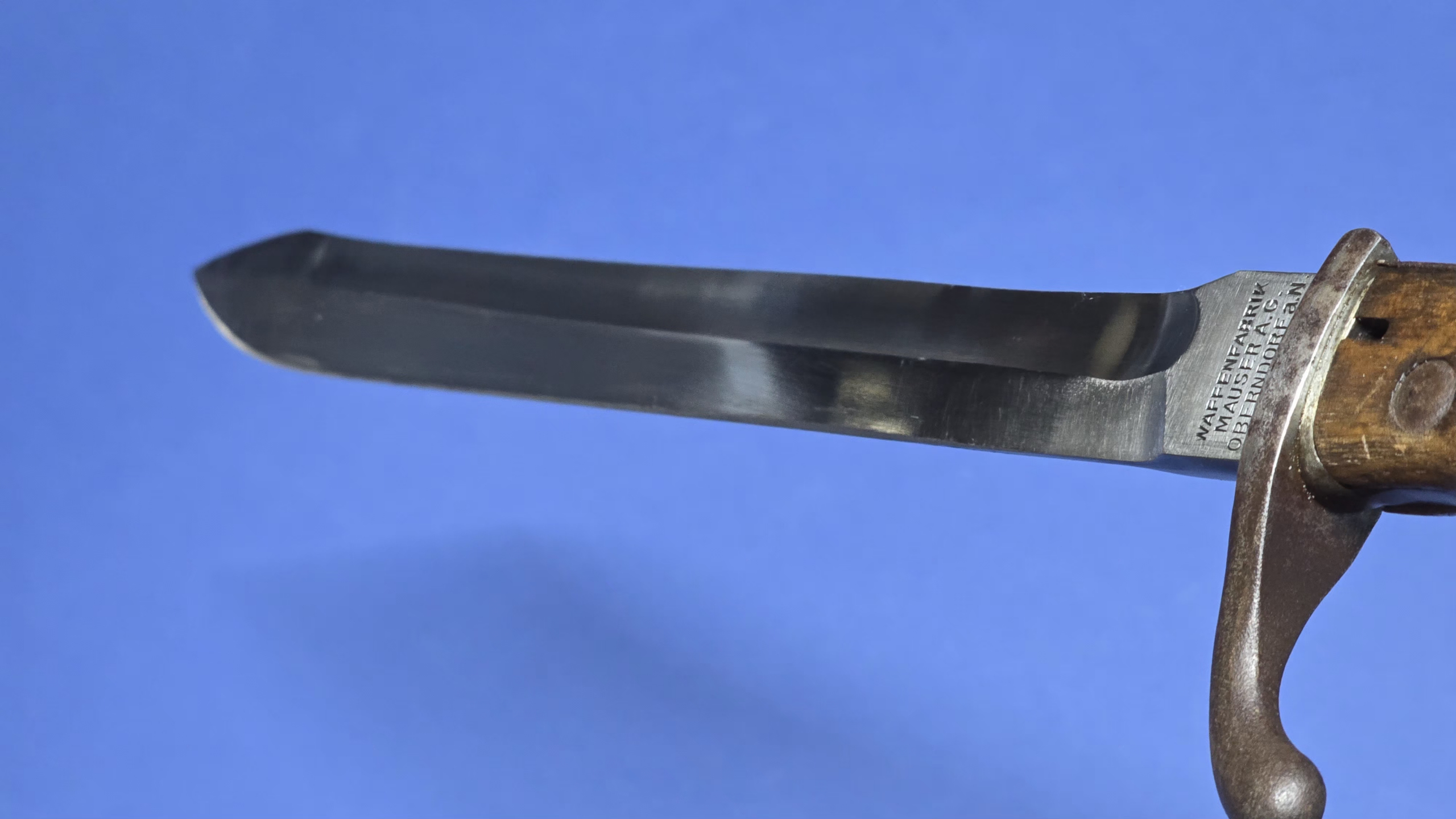 The blade is super clean and bright, and free from any damage or rust. The blade has been sharpened, but very neatly done, and displays a well defined tip. The rear ricasso is marked Waffenfabrik Mauser A.G. Oberndorf a/N, which is nicely stamped and easily readable. On the spine of the blade we have the usual marking’s, a crown with a “W” underneath, the number “16” referring to the date “1916”, and an inspection stamp.