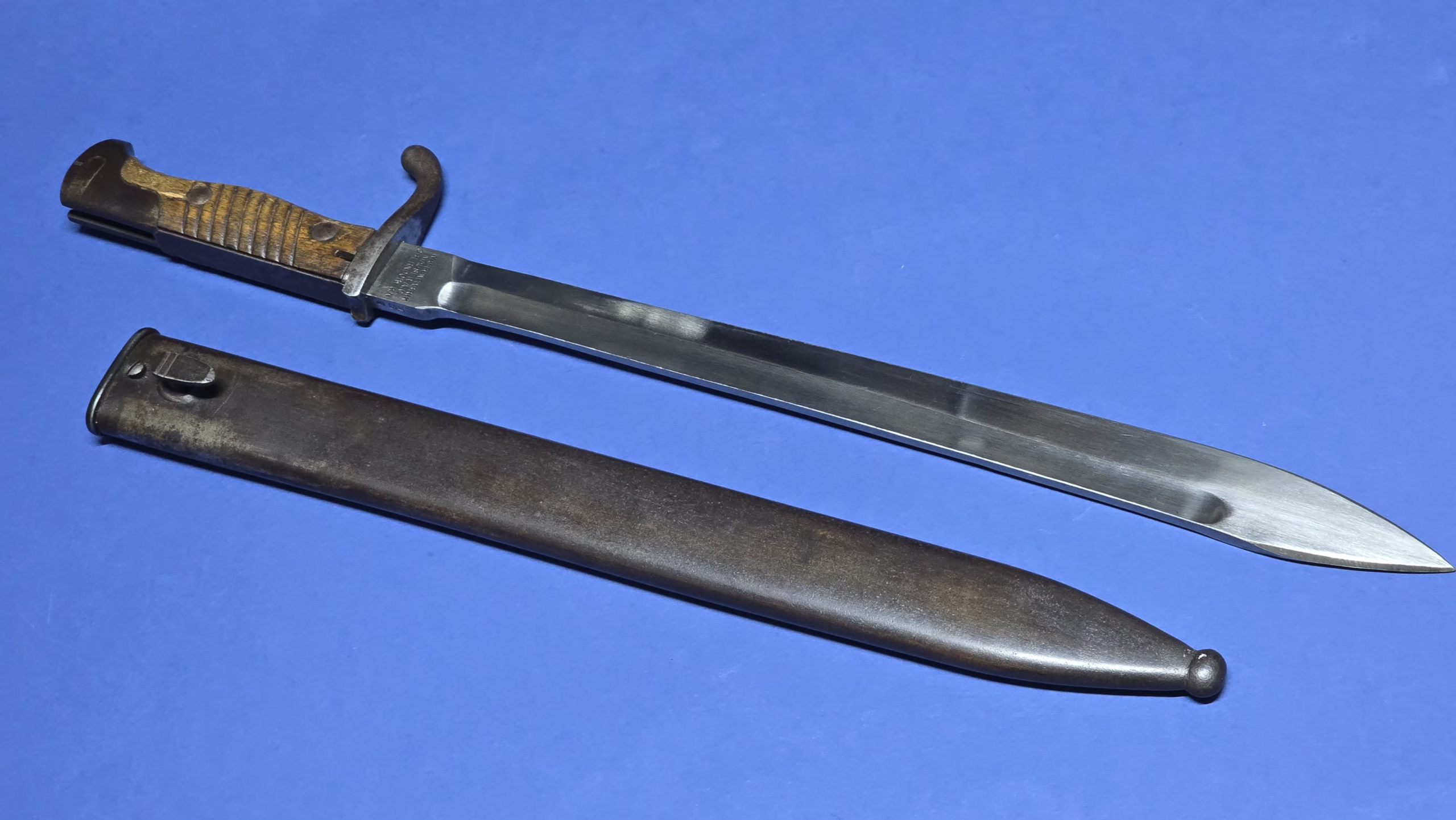 A solid and honest example of a World War I German S98/05 “butcher” bayonet, dated 1916, showing the removal of the sawback. This is a good, collector-grade piece with clear markings and a consistent overall appearance, reflecting both its wartime use and modification. Sawback blades became controversial during the First World War due to their perceived brutality, and were often ground down during wartime service.