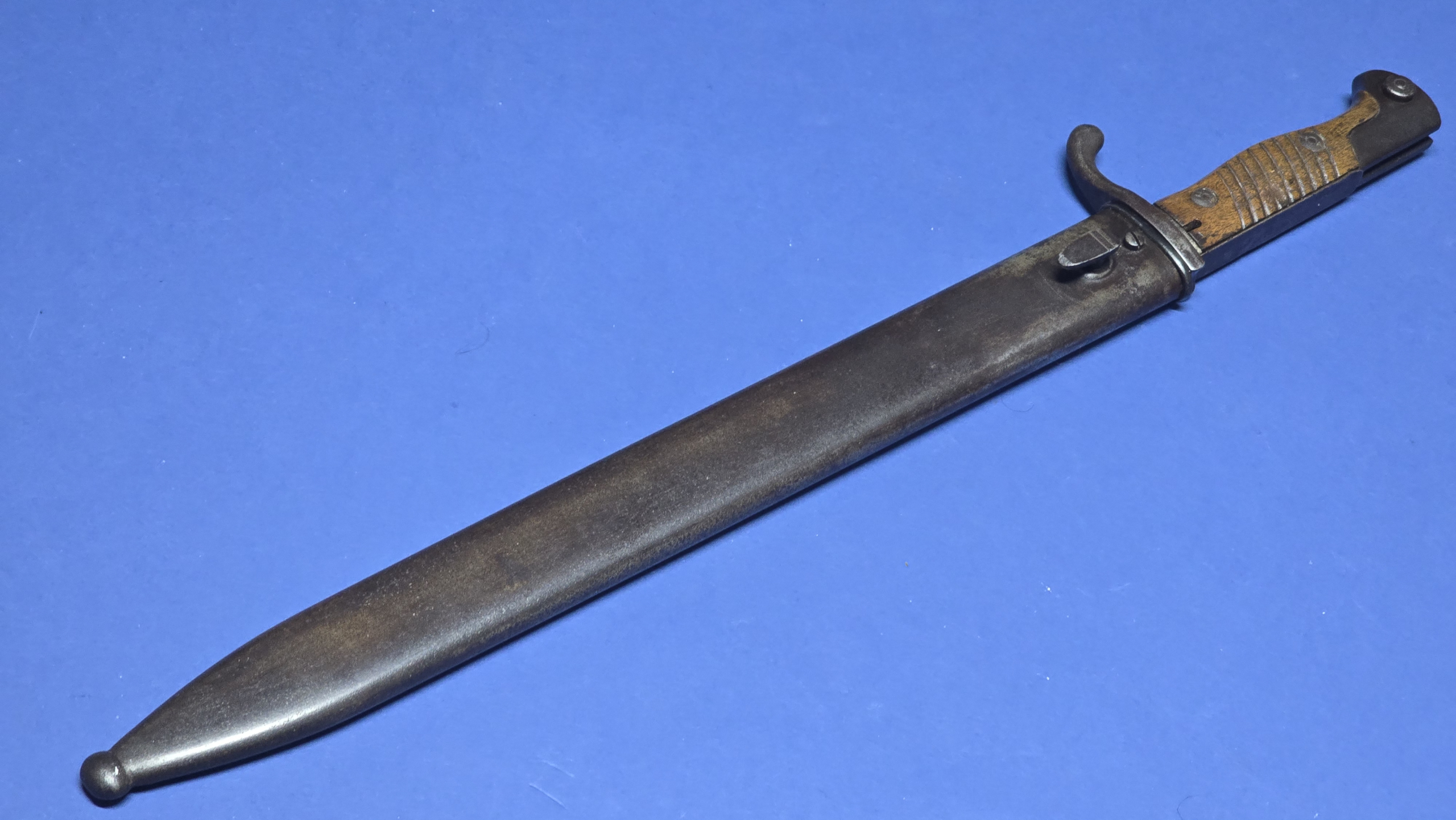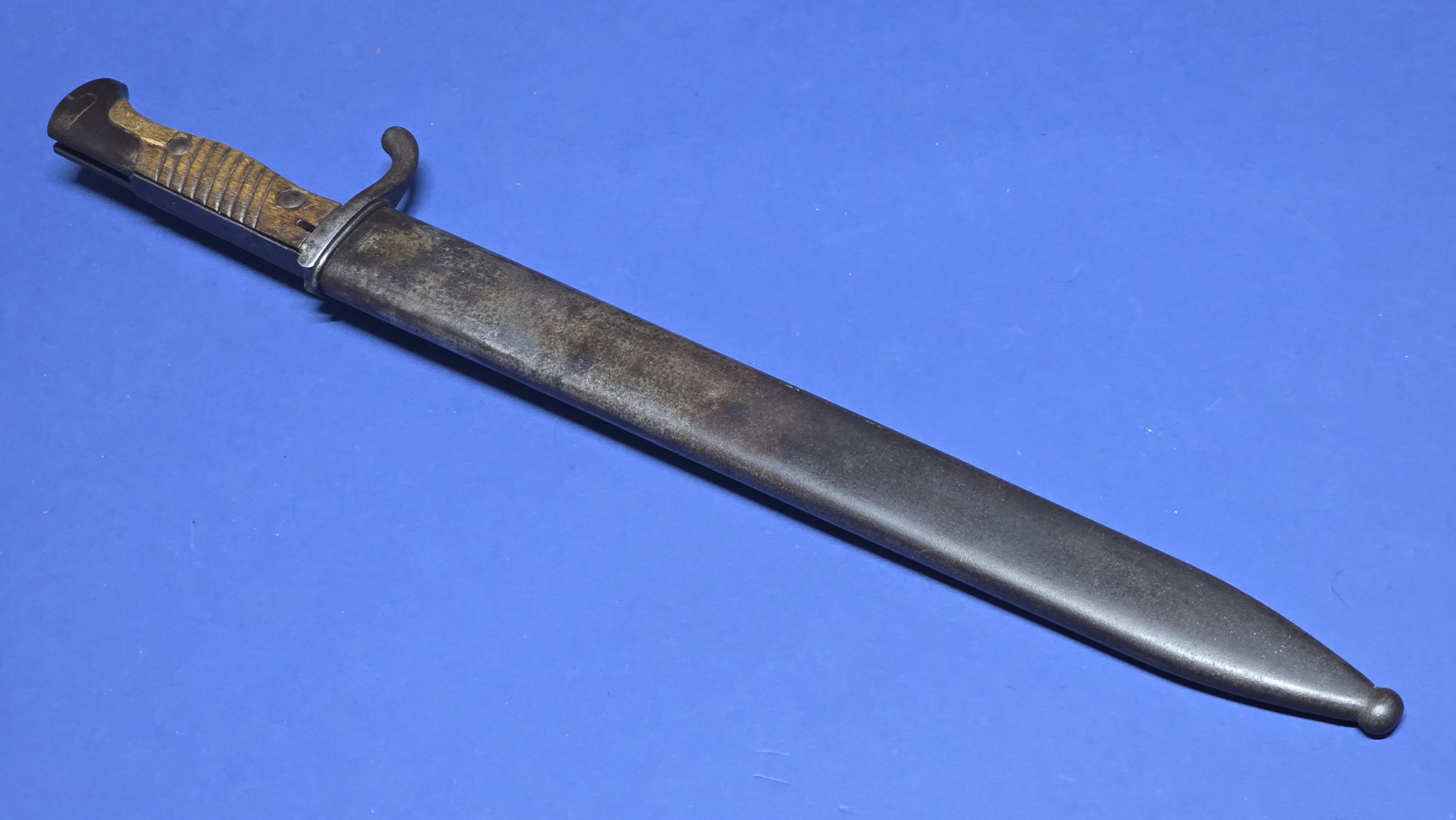 The bayonet is fitted with its original wooden grips, with an attractive light tone in colour, and overall in good condition. There is some minor chipping to one side, but nothing excessive.