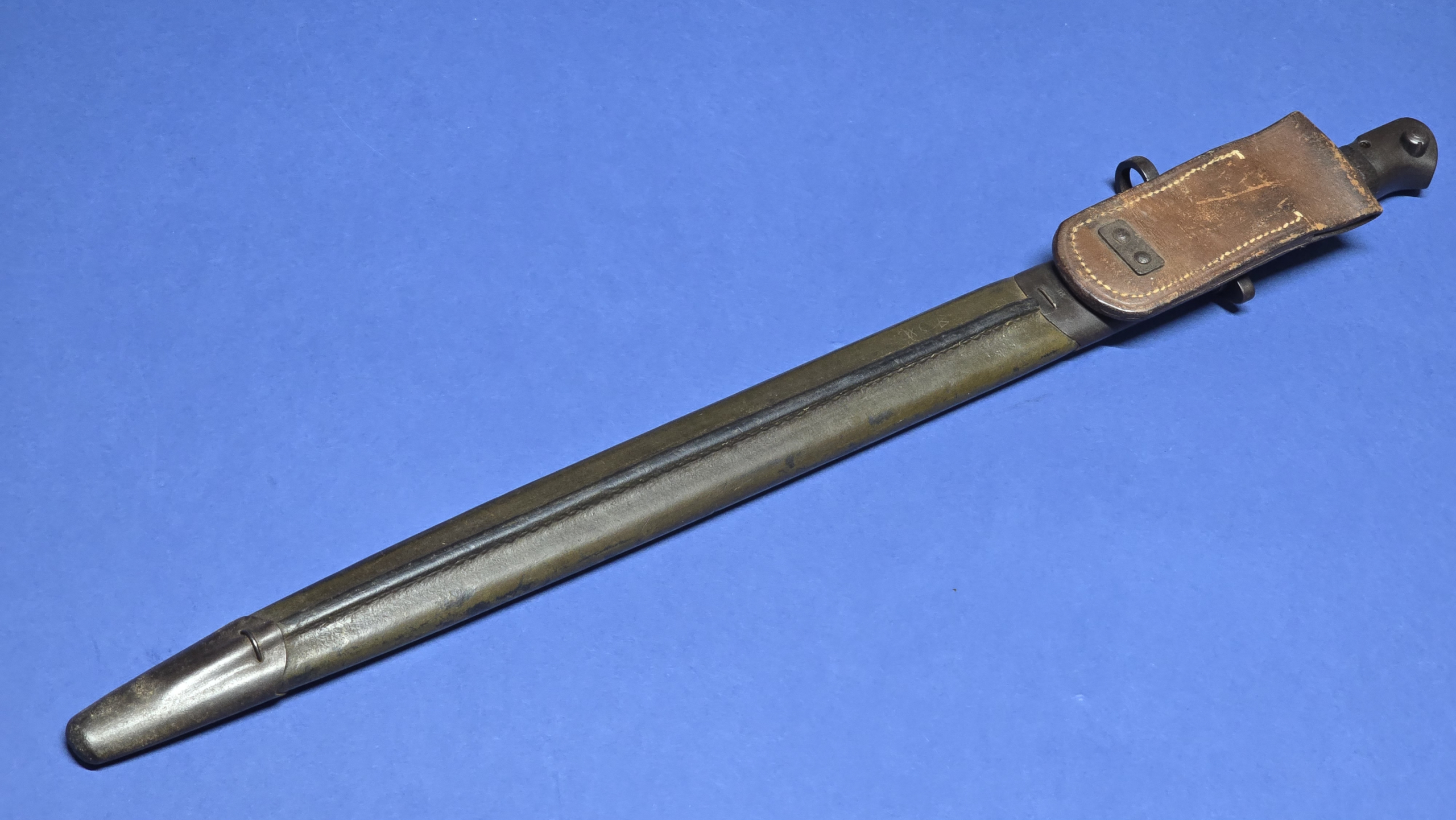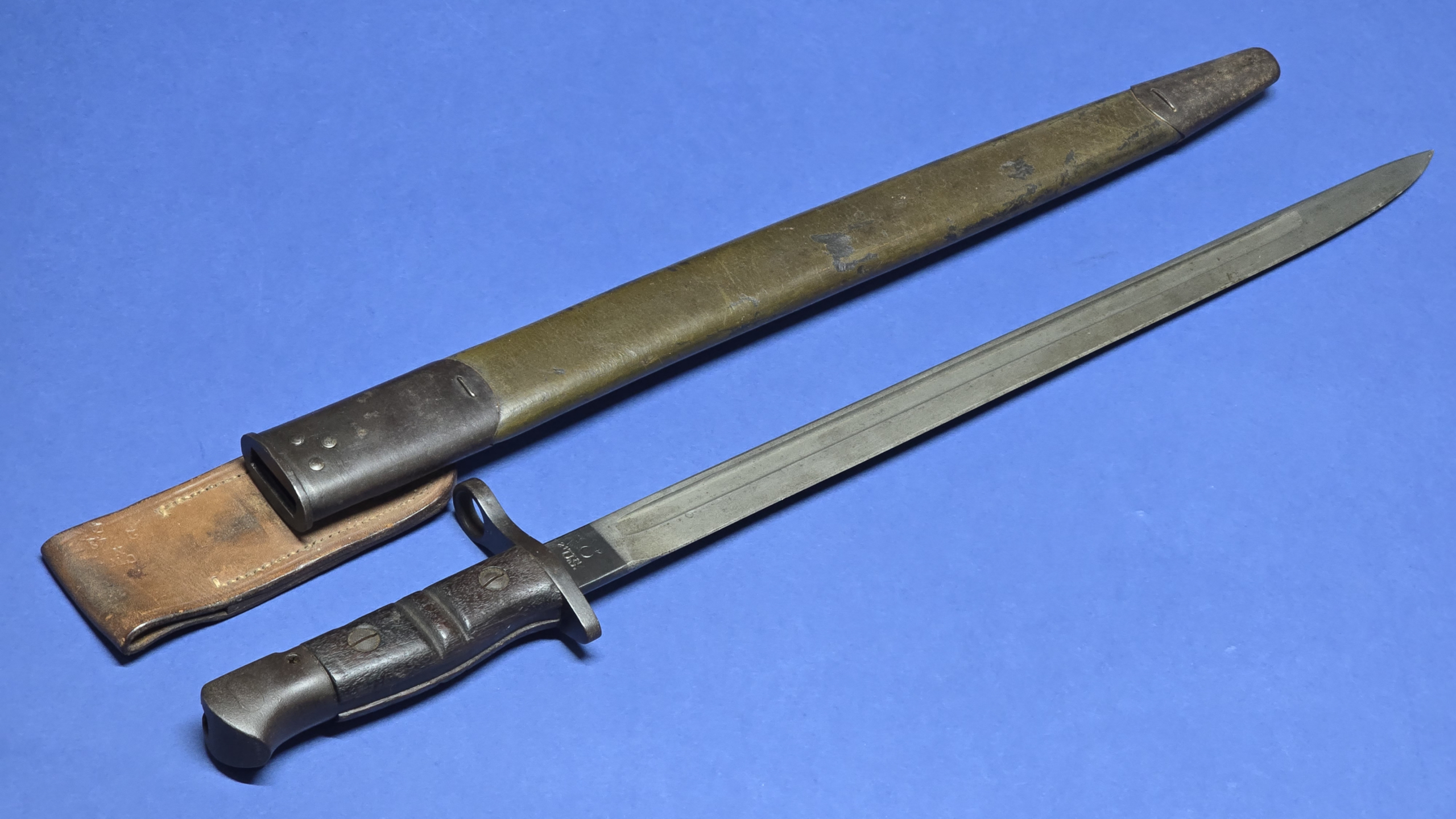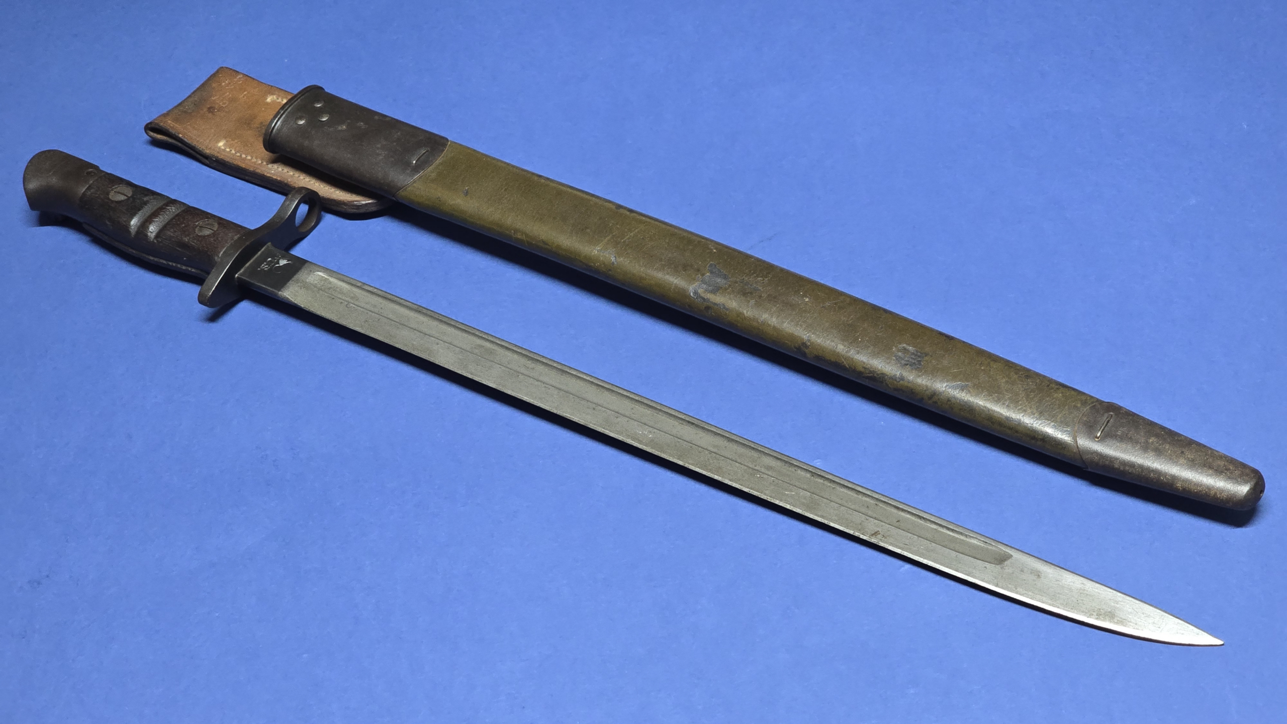 A solid and honest U.S. Model 1917 bayonet manufactured by Remington in 1917, later re-inspected in 1921, retaining its correct scabbard and mounted in a British 1942 dated leather frog. A very good example, featuring an interesting and uncommon British-applied belt loop variation.
