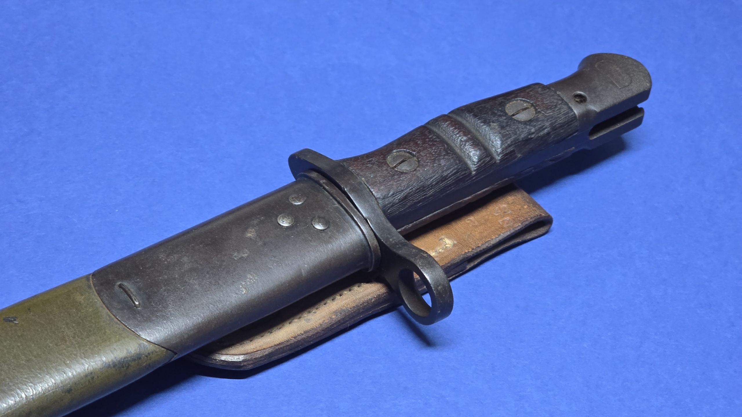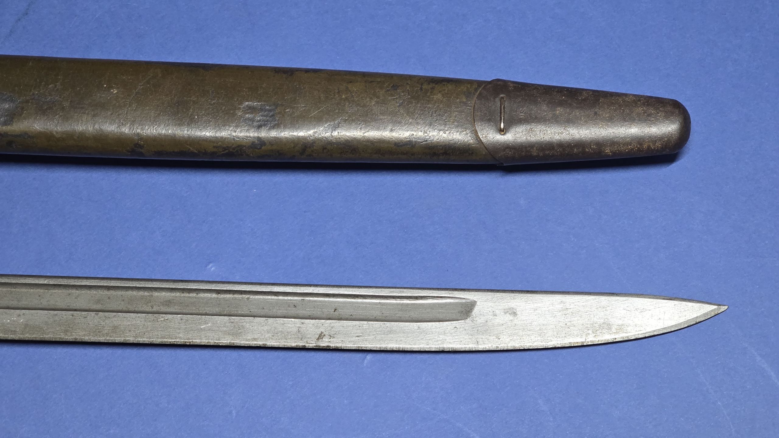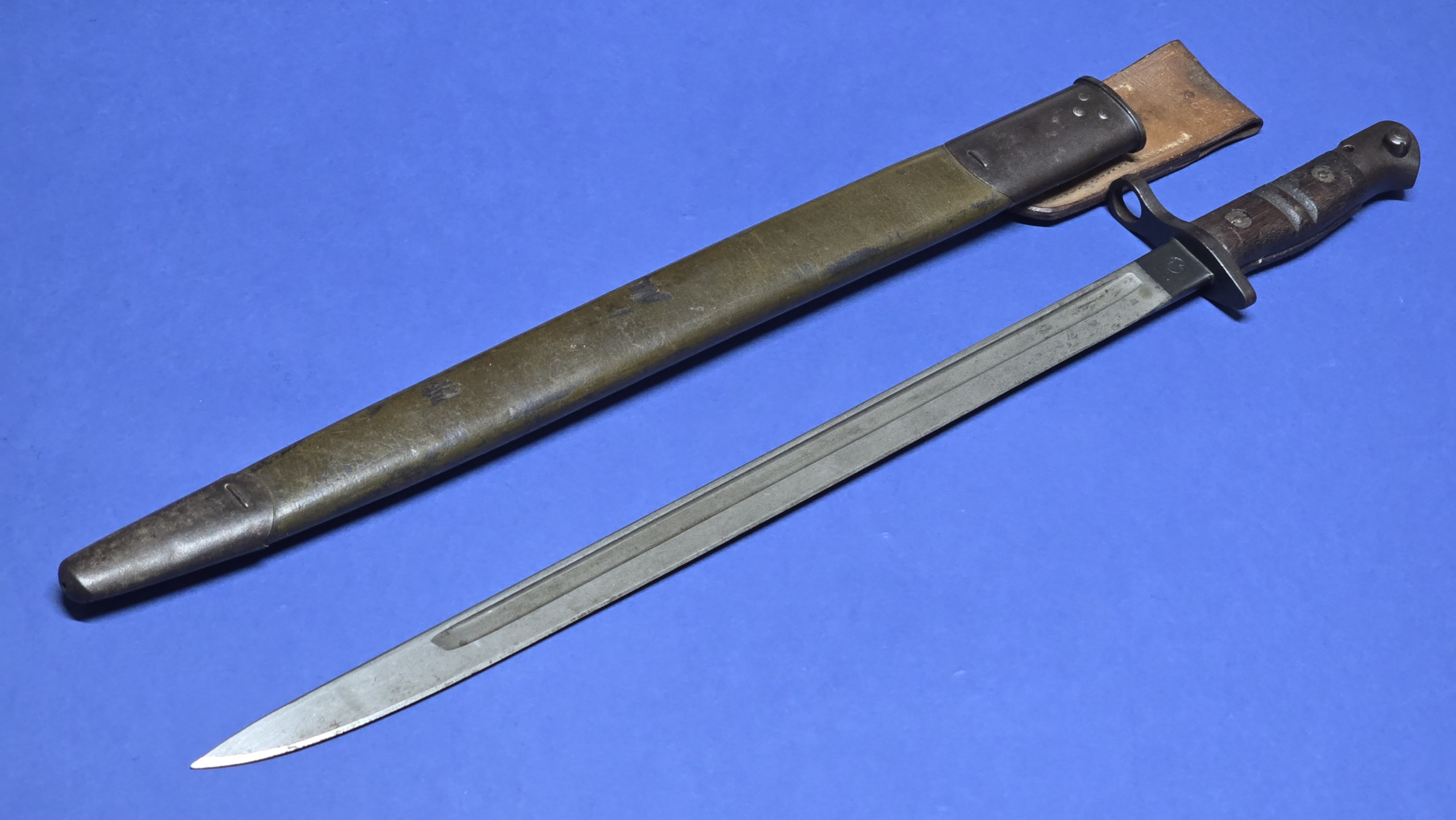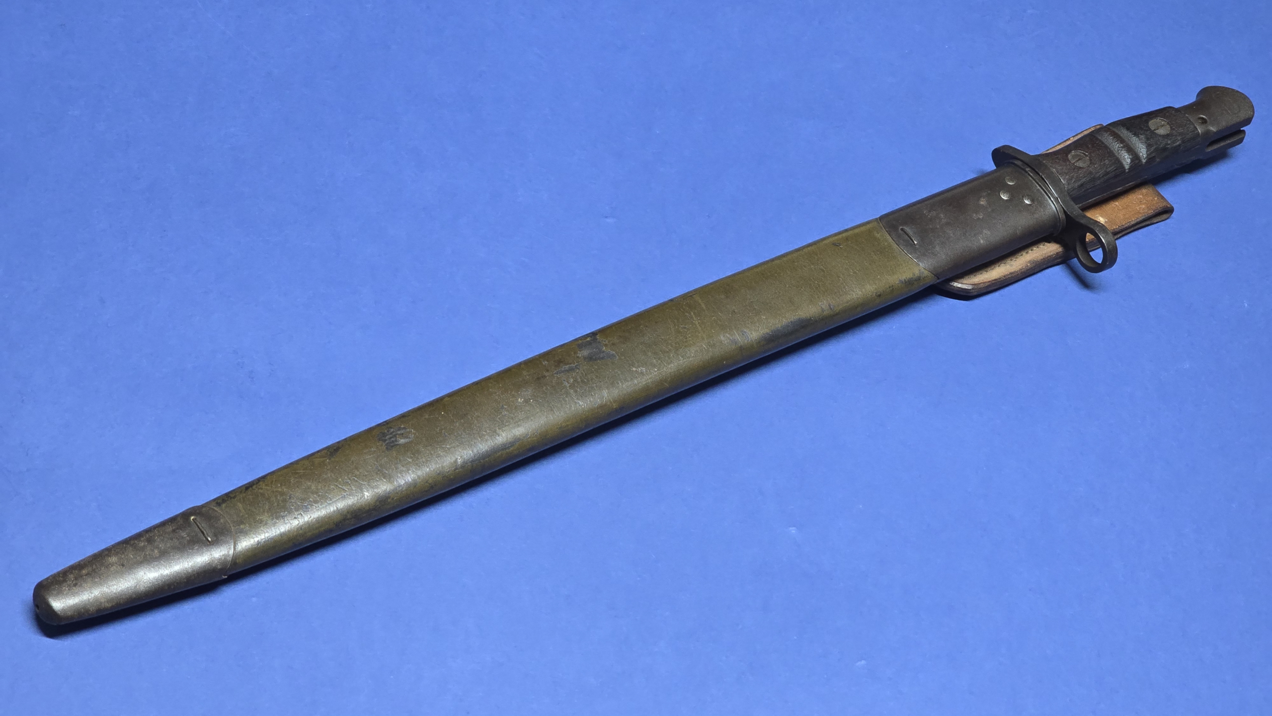 A solid and honest U.S. Model 1917 bayonet manufactured by Remington in 1917, later re-inspected in 1921, retaining its correct scabbard and mounted in a British 1942 dated leather frog. A very good example, featuring an interesting and uncommon British-applied belt loop variation.