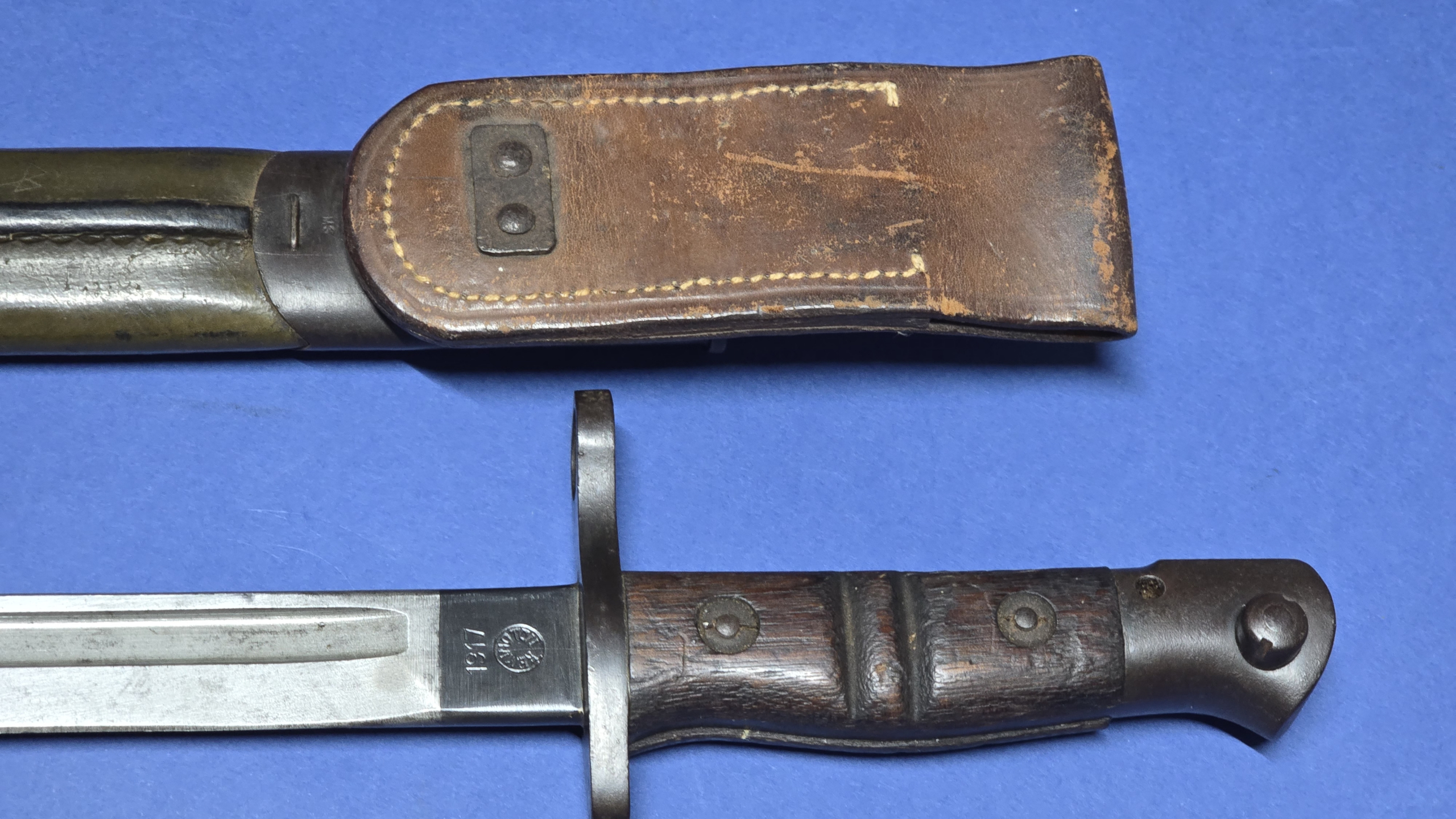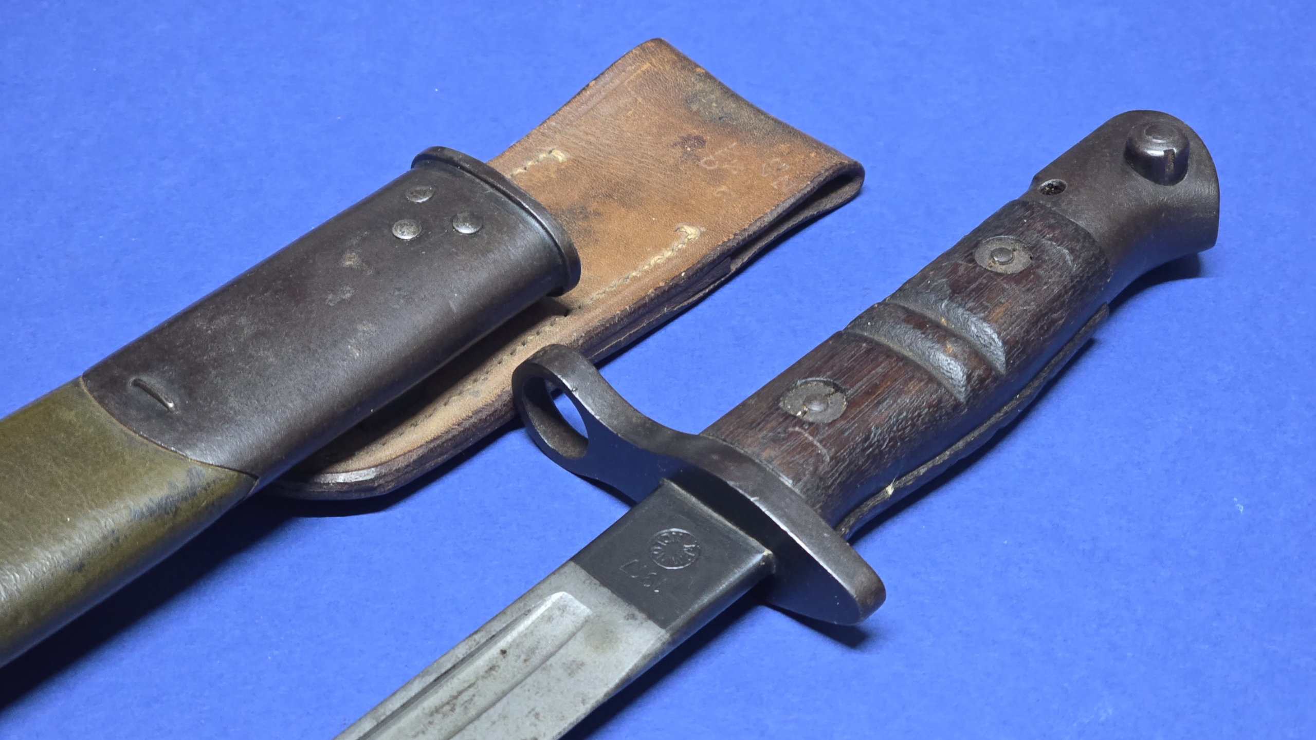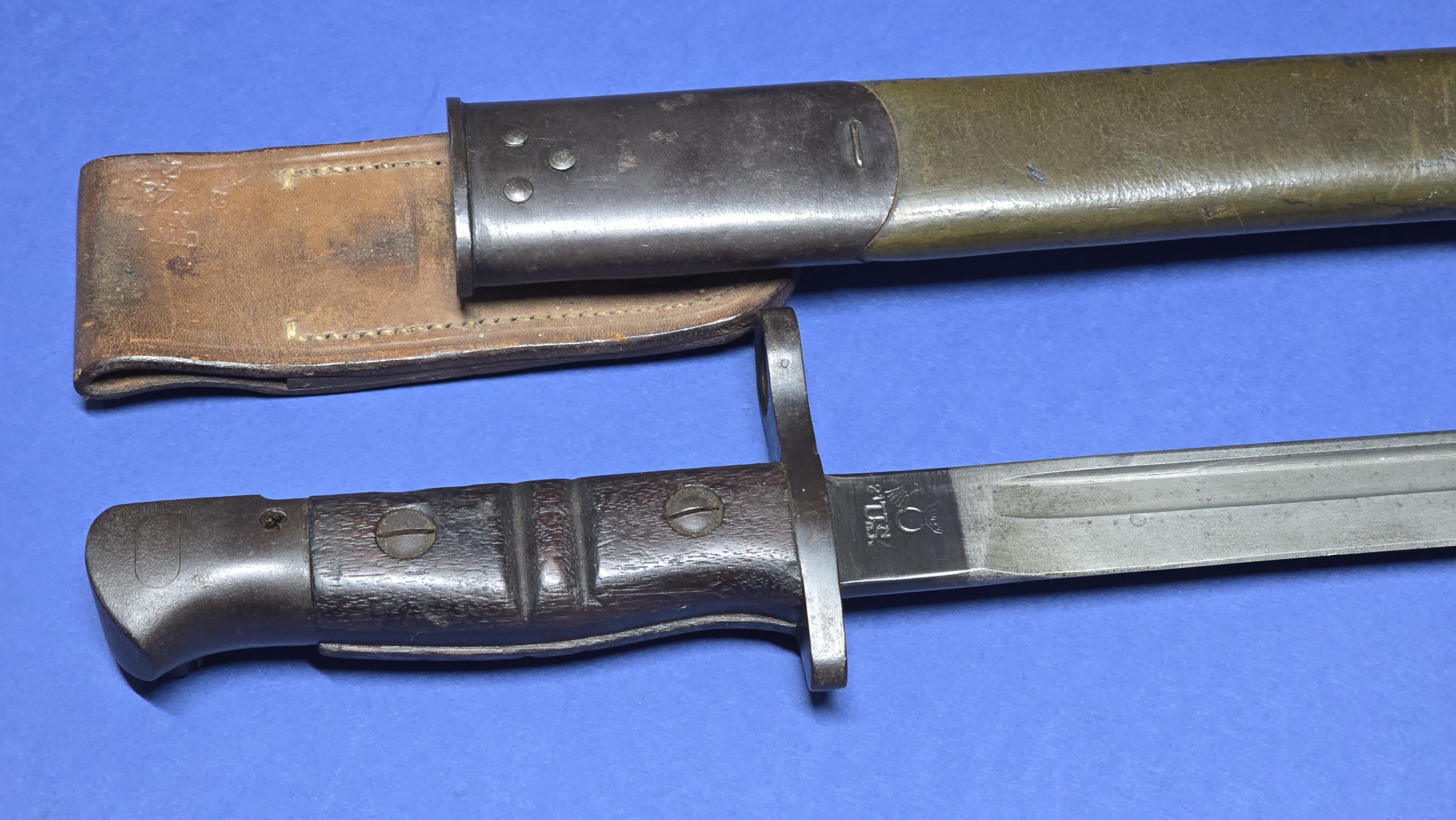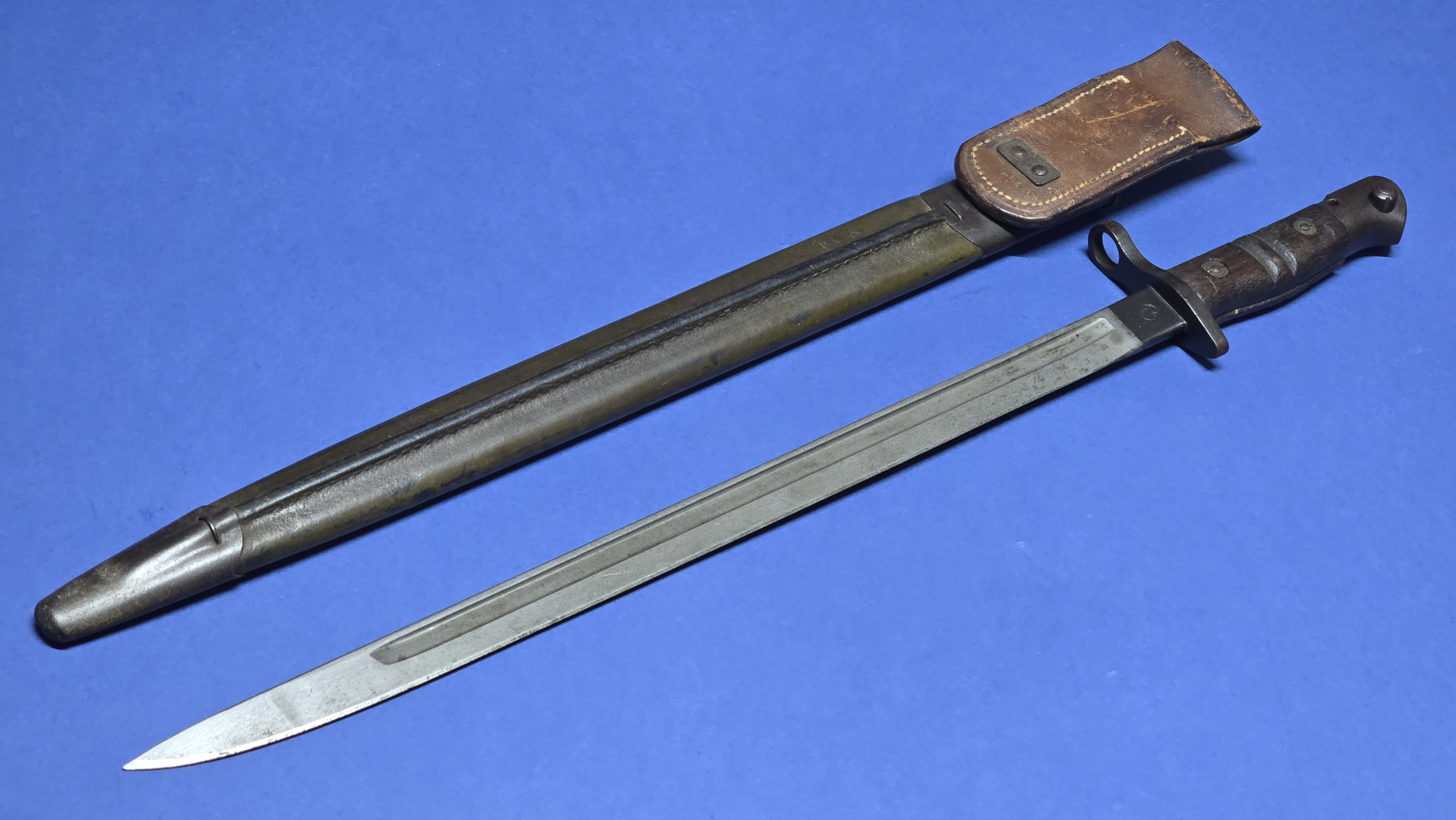 An honest, correctly marked U.S. Model 1917 bayonet by Remington, dated 1917, re-inspected in 1921, complete with scabbard and an interesting WWII British leather frog. Not presented as a factory-original set, the British frog likely represents later service-life use, suggesting the bayonet may have seen continued issue during WWII. A great example with clear markings and good condition throughout.