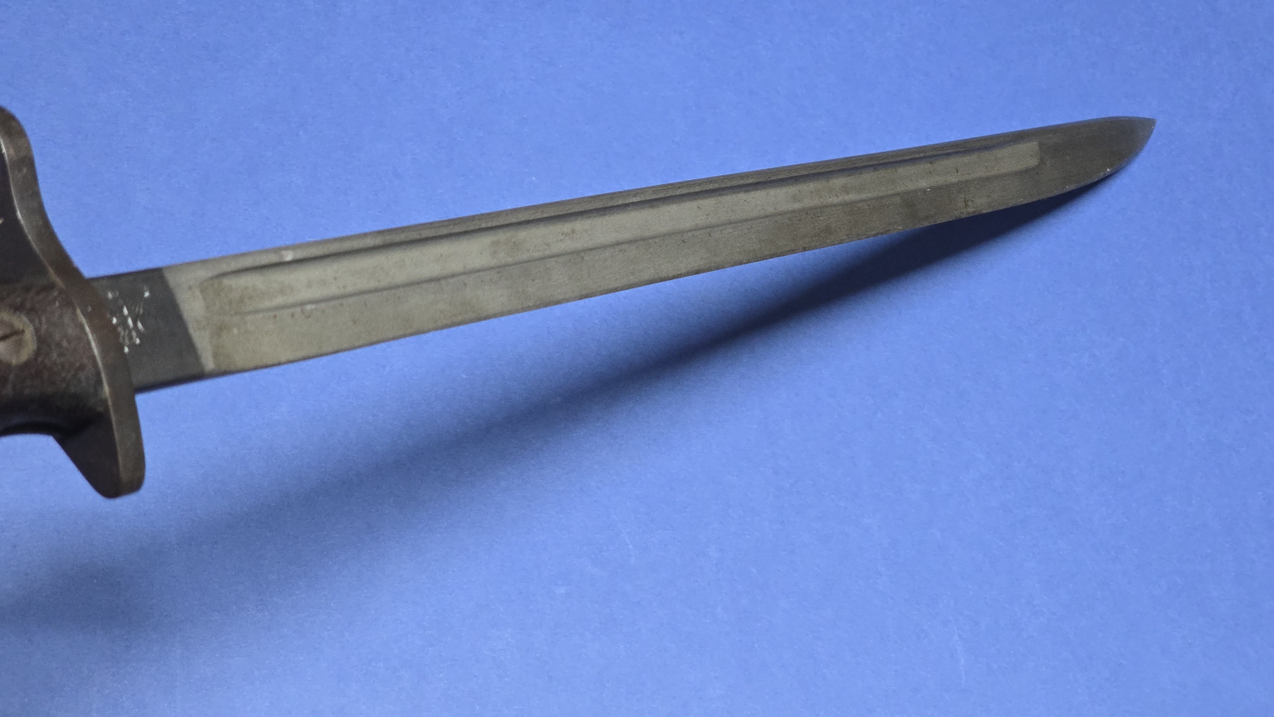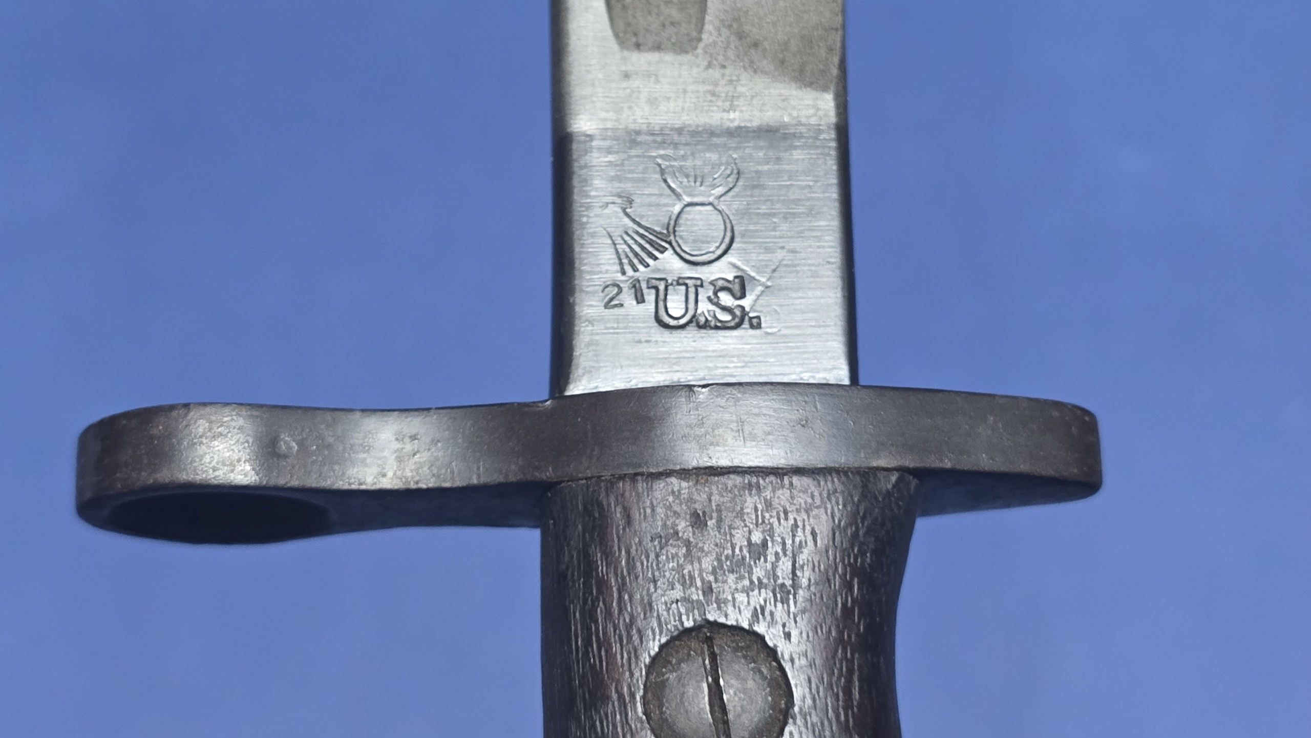 The 17-inch blade remains in very good condition, showing light age-related wear, but presenting extremely well overall. The edge has been evenly sharpened with a consistent profile and appears to be period service sharpening rather than later aggressive grinding. The tip is clean and intact. The ricasso retains its original blued finish. Markings are clear and correct: 1917 date with circular Remington maker’s mark to one side; flaming bomb ordnance stamp with U.S. property mark to the other; small “21” re-inspection stamp denoting 1921 arsenal inspection; and a faint but visible “X” bend test stamp.