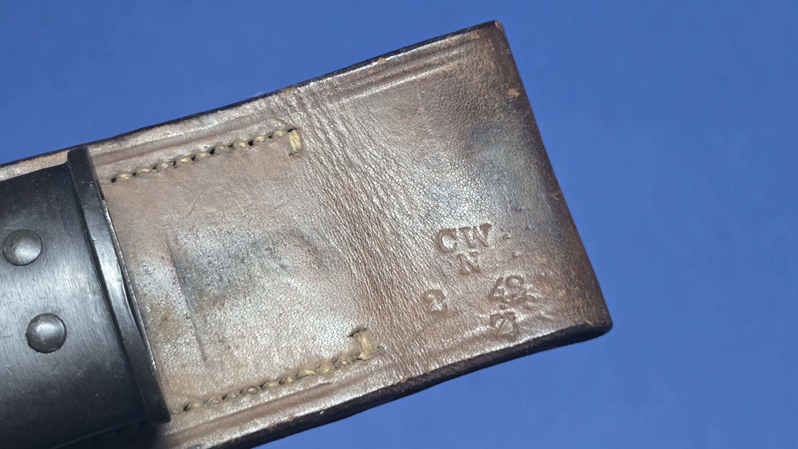 Mounted to the scabbard is a British leather frog stamped CWS and dated 2/42, indicating manufacture by the Co-operative Wholesale Society in 1942. This represents a later wartime pairing rather than original WWI issue, but is entirely plausible as a service combination. The leather remains supple with clear markings and strong stitching.