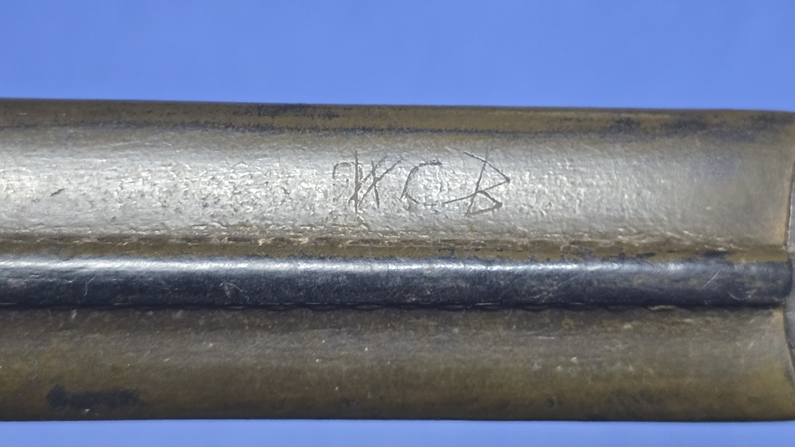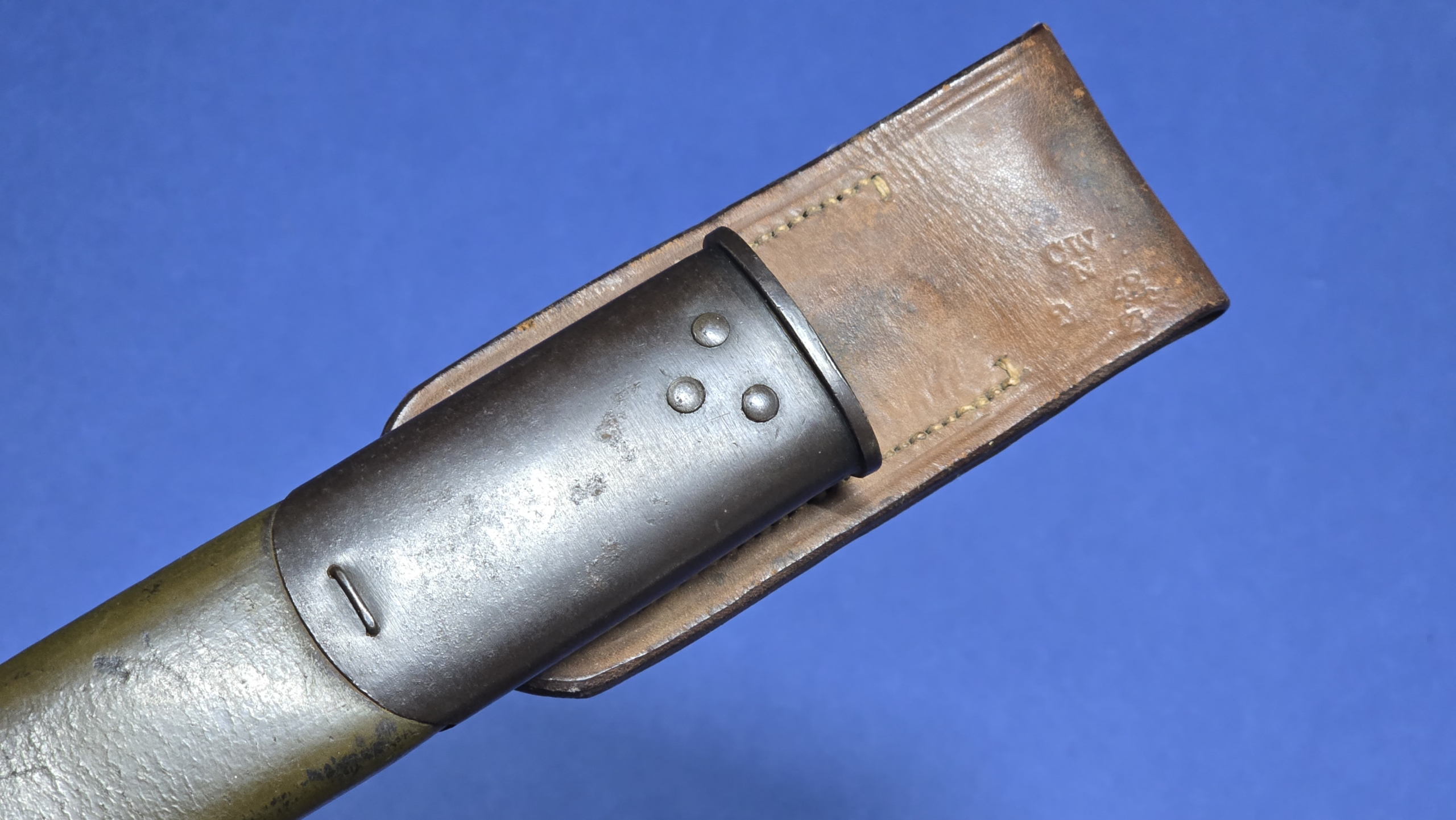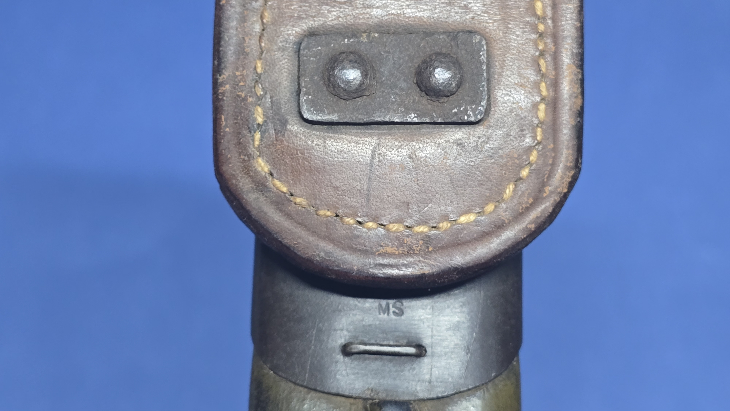 The bayonet is housed in its correct U.S. pattern scabbard finished in olive drab paint, retaining approximately 97% of its original finish. The metal throat and lower fitting are undamaged with light surface oxidation to the lower mount. Both fittings are marked “MS.” Rear stitching remains tight and intact. The reverse shows lightly scratched initials “WCB,” likely the owners initials; these are shallow and you only see them up close. The bayonet fits the scabbard correctly and securely.