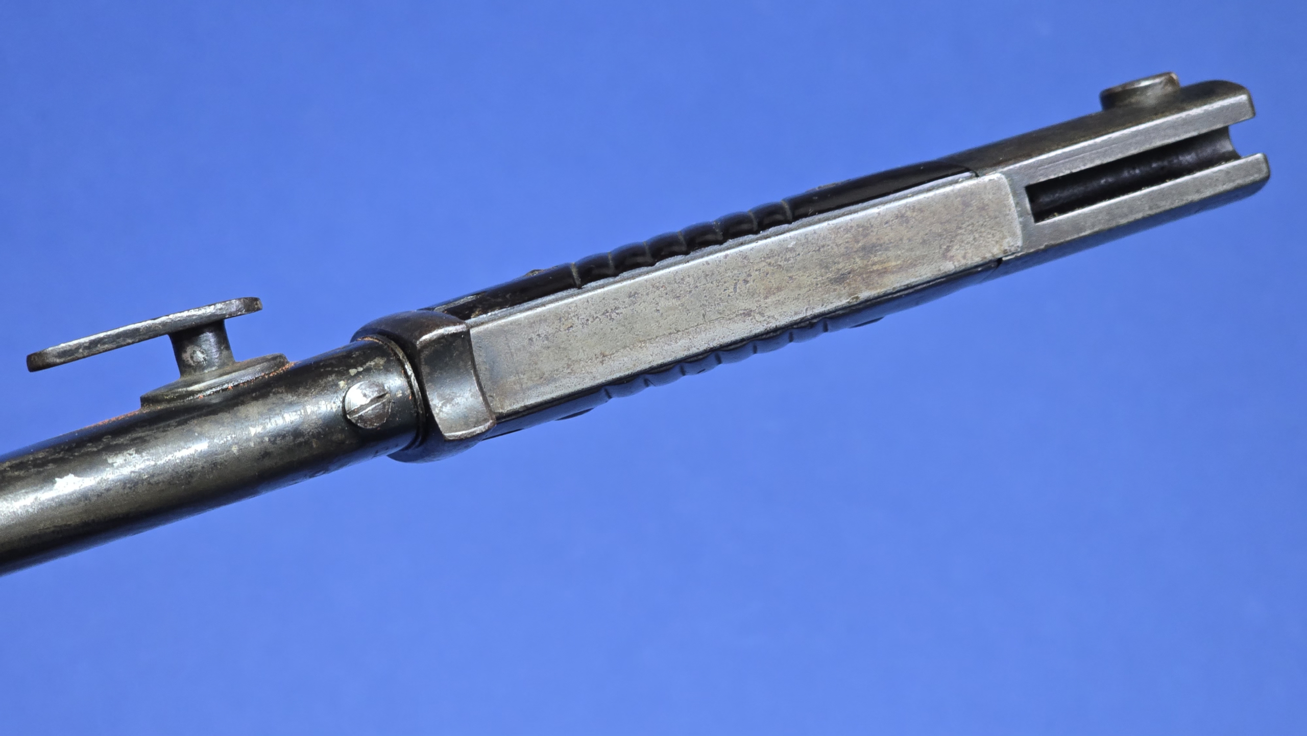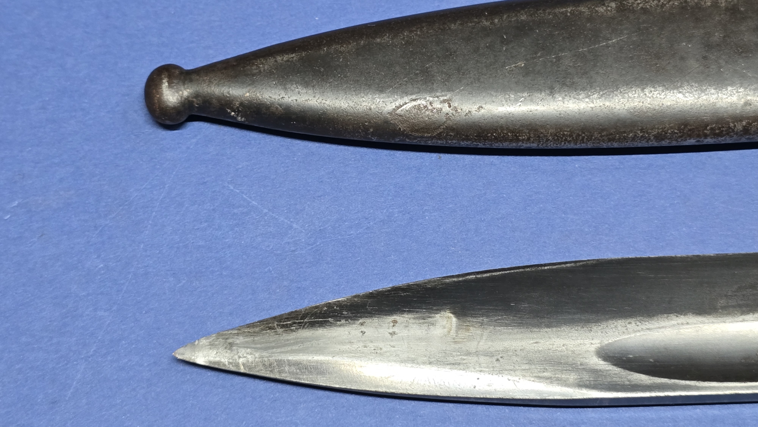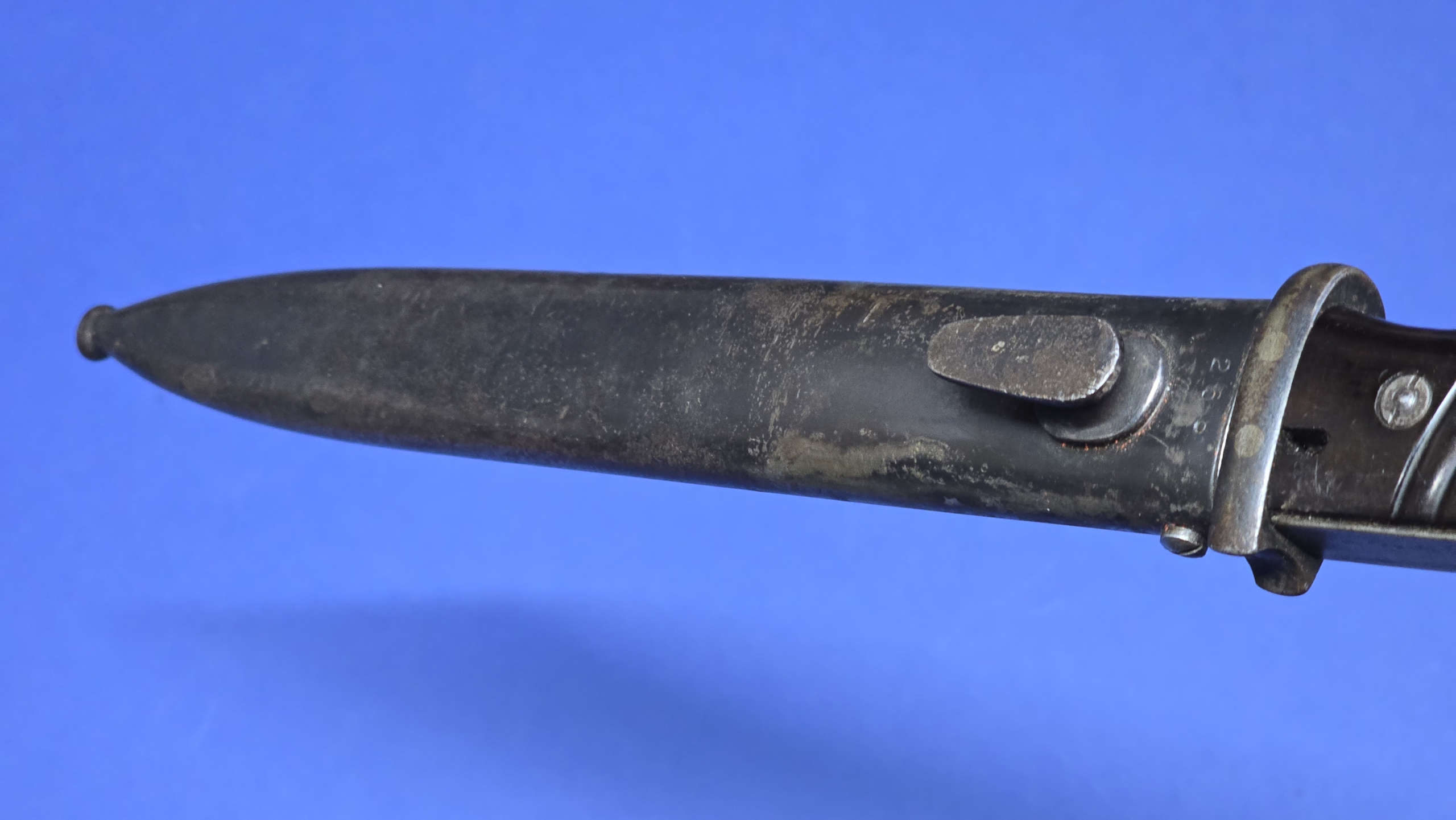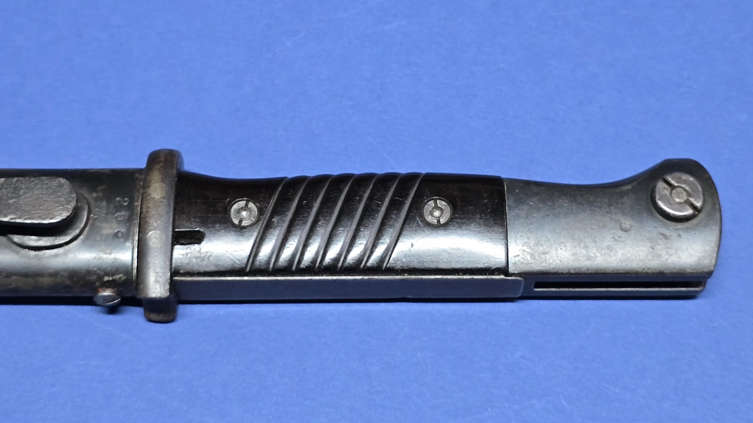 Dark Bakelite grips in very good condition, secured by the original screw bolts. The flash guard is free from damage and the rifle retaining button functions correctly. Two Waffenamt inspection stamps are present to the pommel, with bluing remaining to the crossguard and pommel.