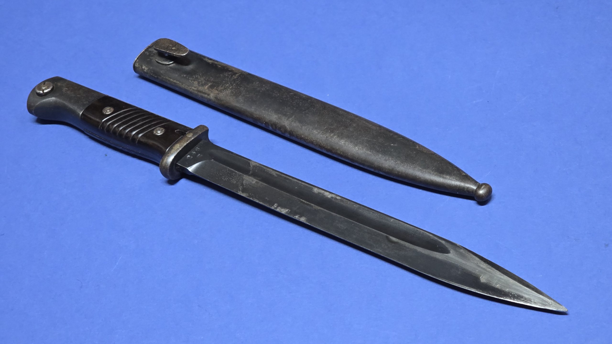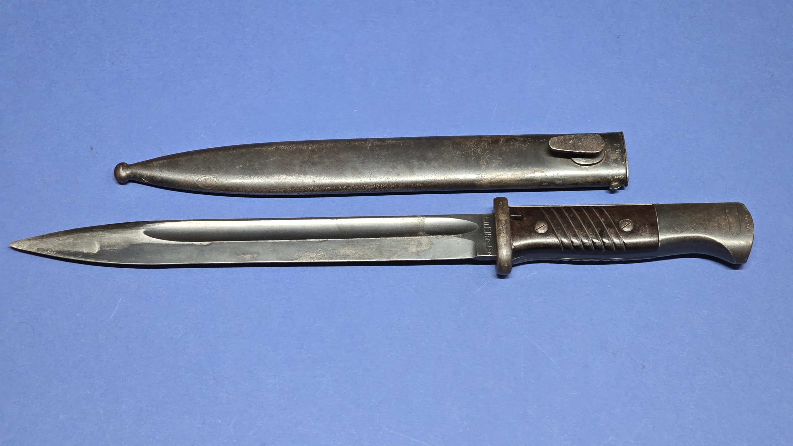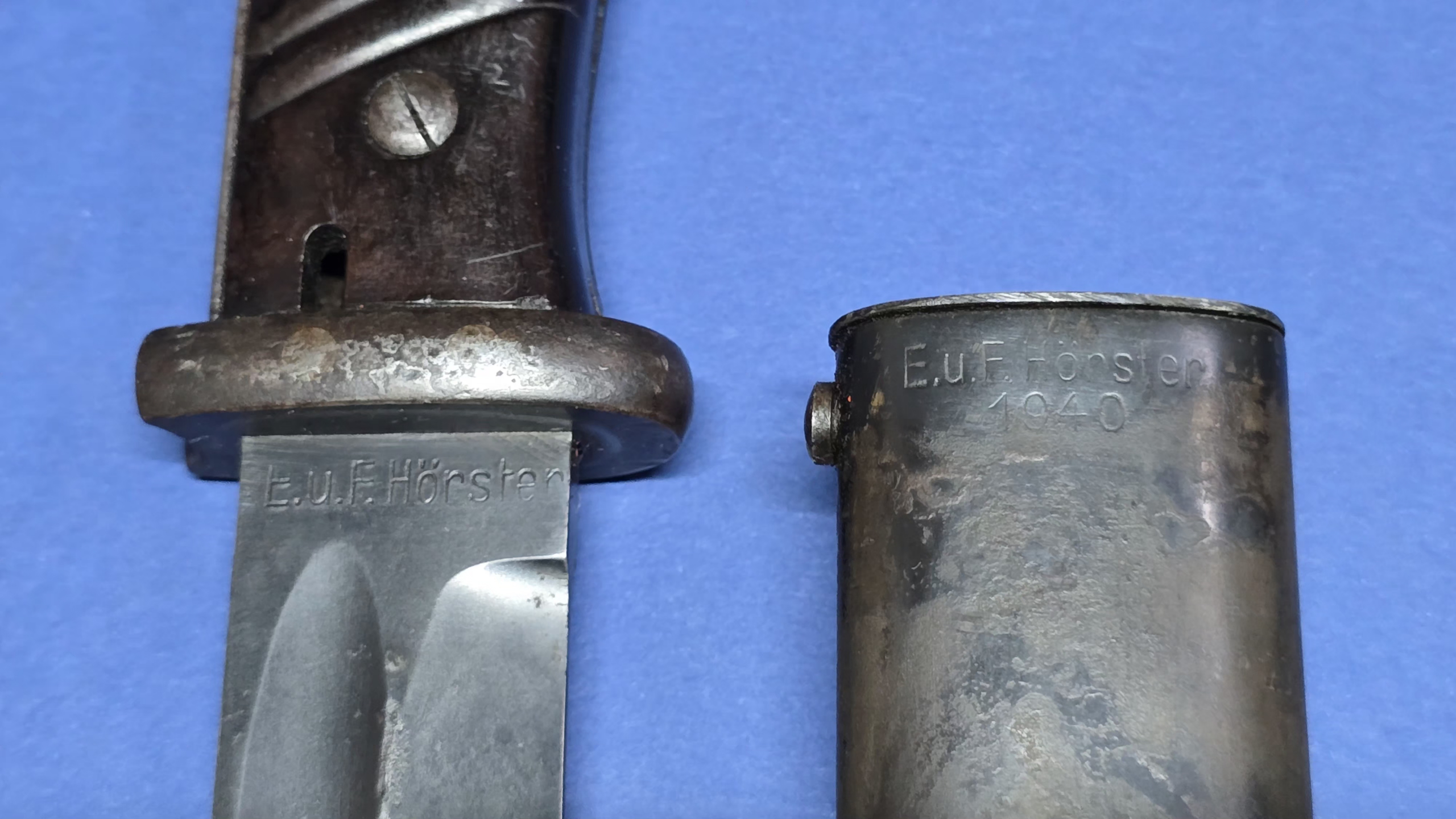 A matching numbers WWII German K98 bayonet by E.u.F. Horster, dated 1940. A good wartime example retaining the majority of its original finish to both the bayonet and scabbard, showing typical age-related wear.