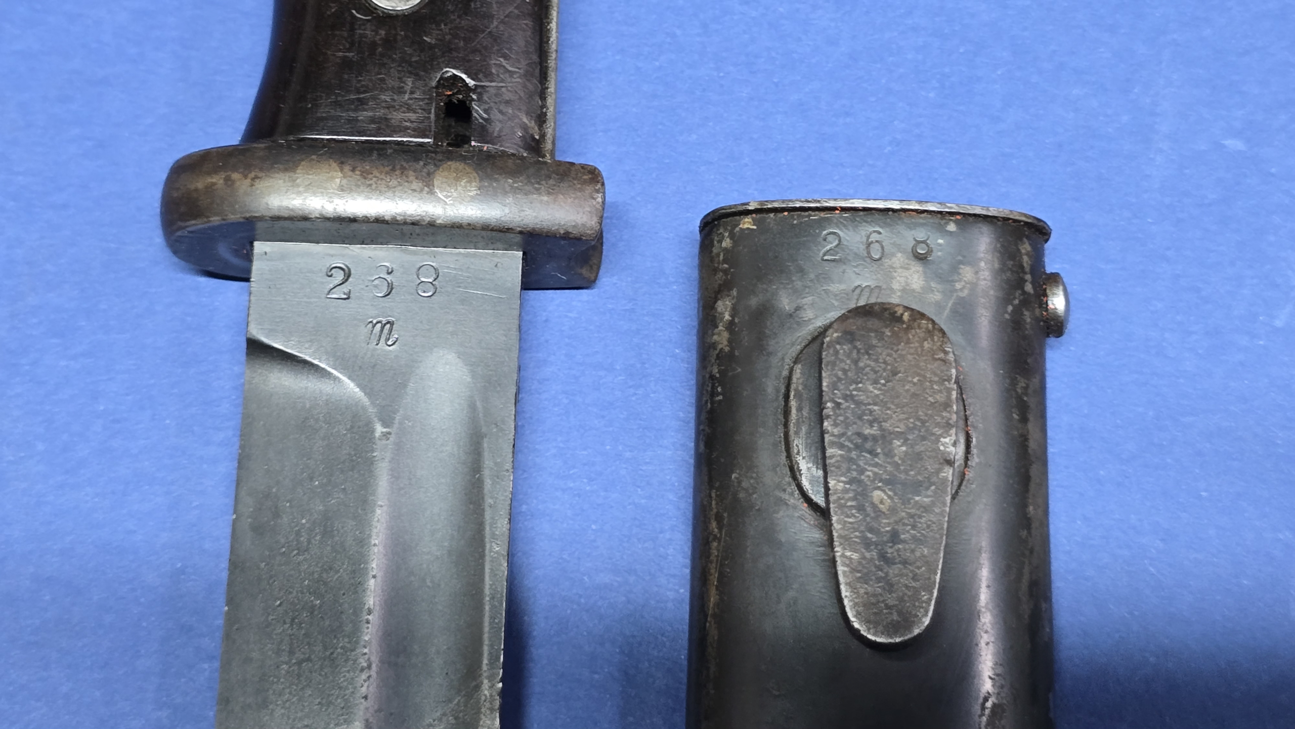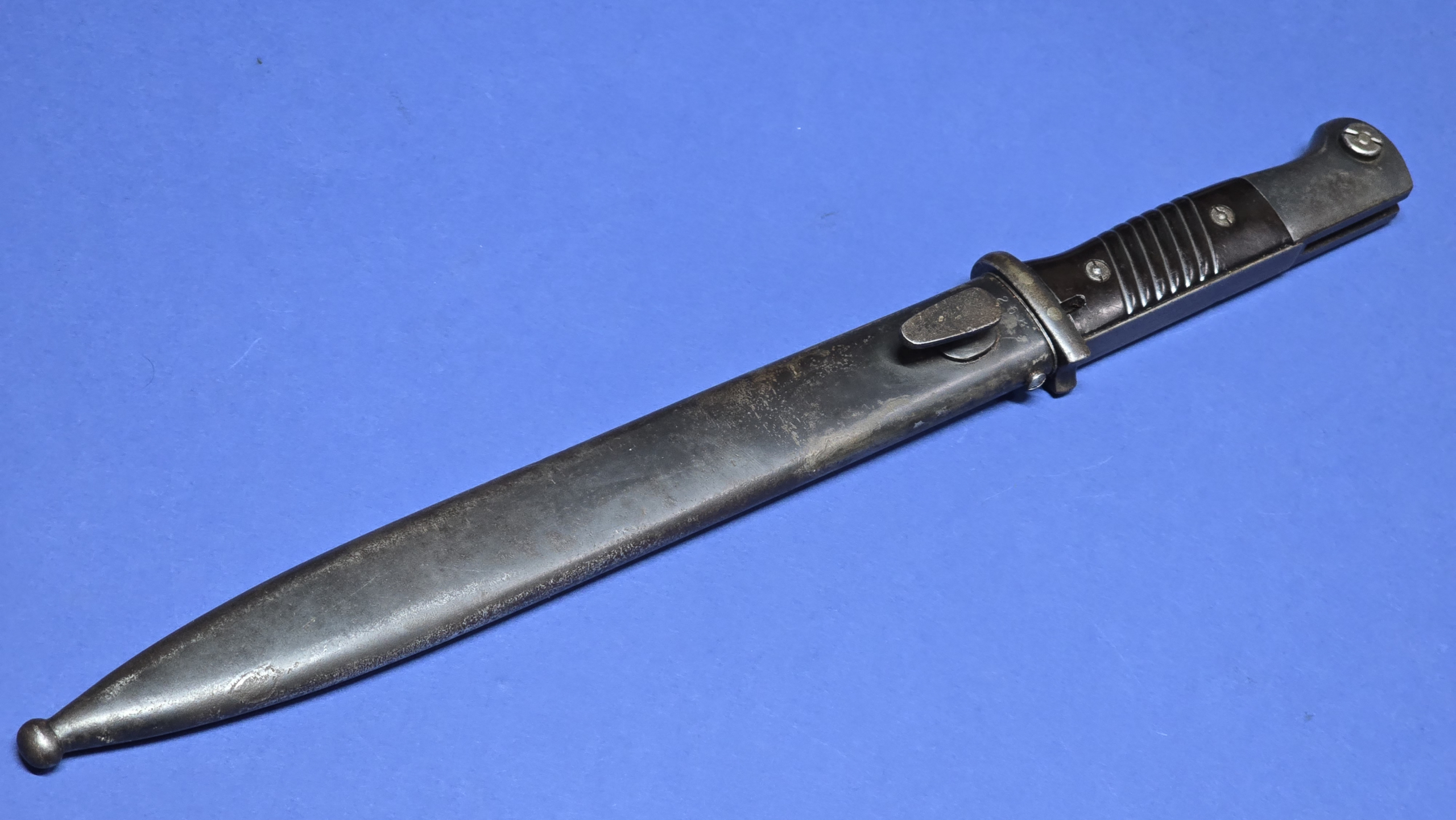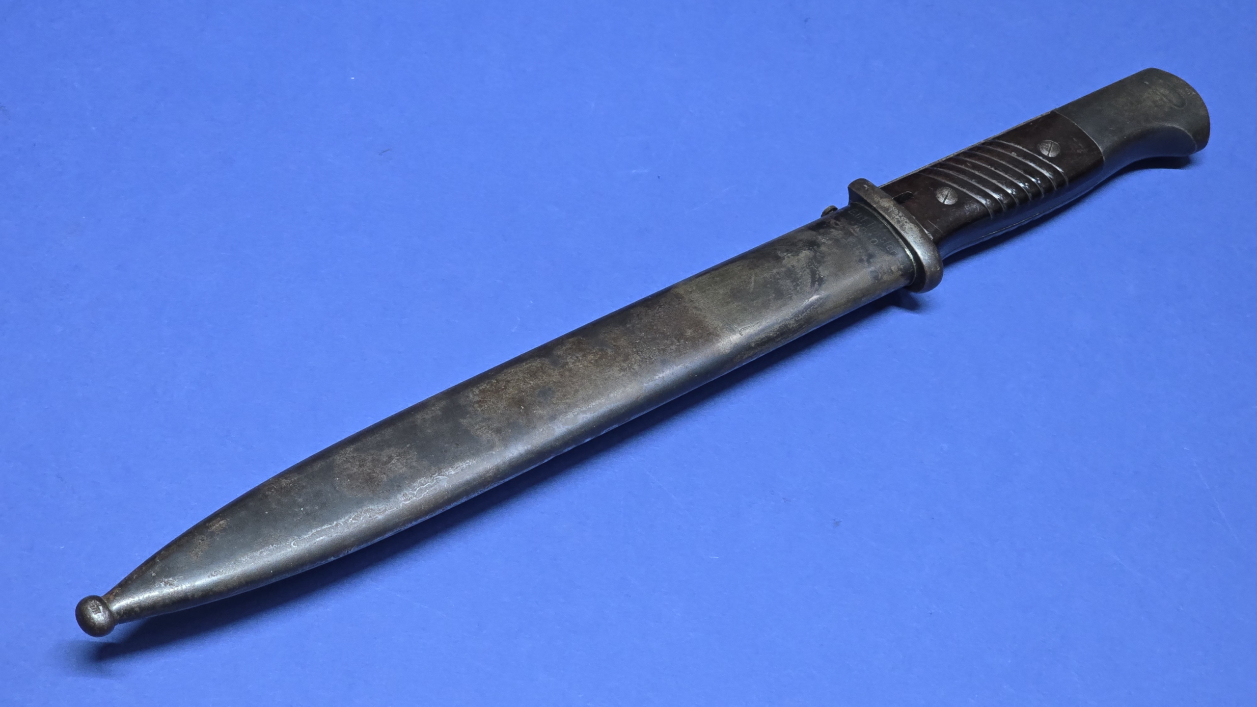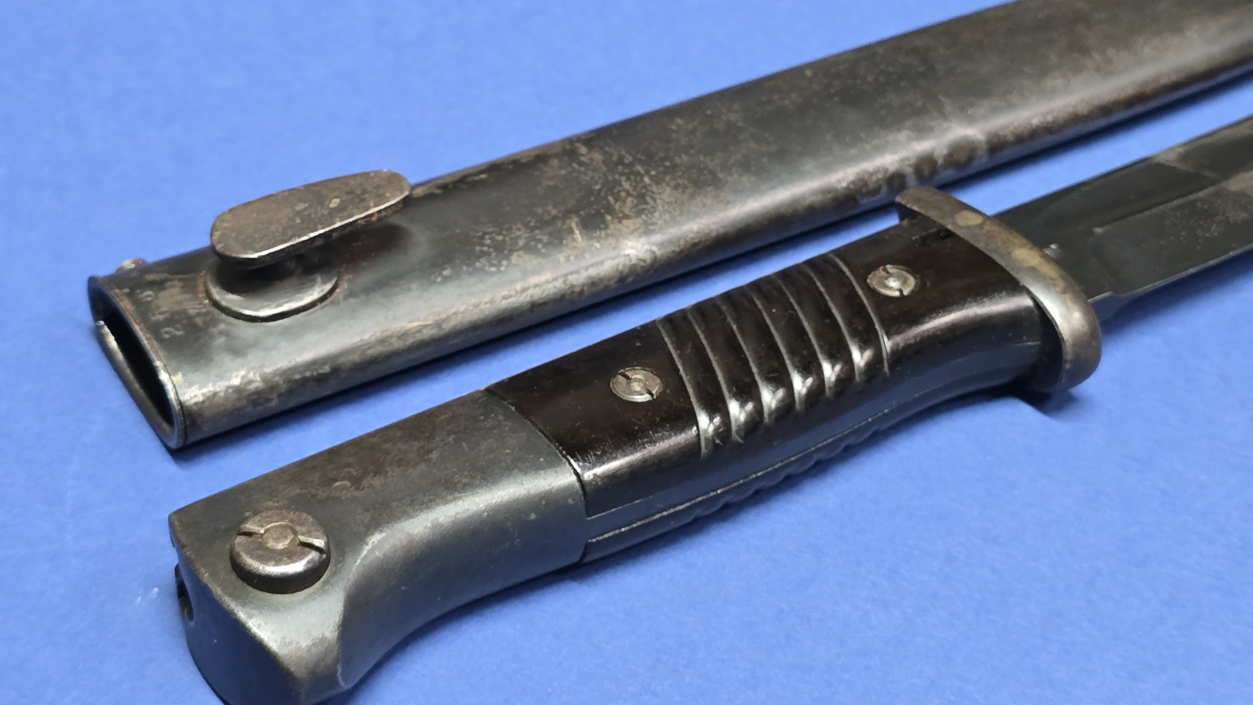 A matching numbers WWII German K98 bayonet by E.u.F. Horster, dated 1940. A good wartime example retaining the majority of its original finish to both the bayonet and scabbard, showing typical age-related wear.