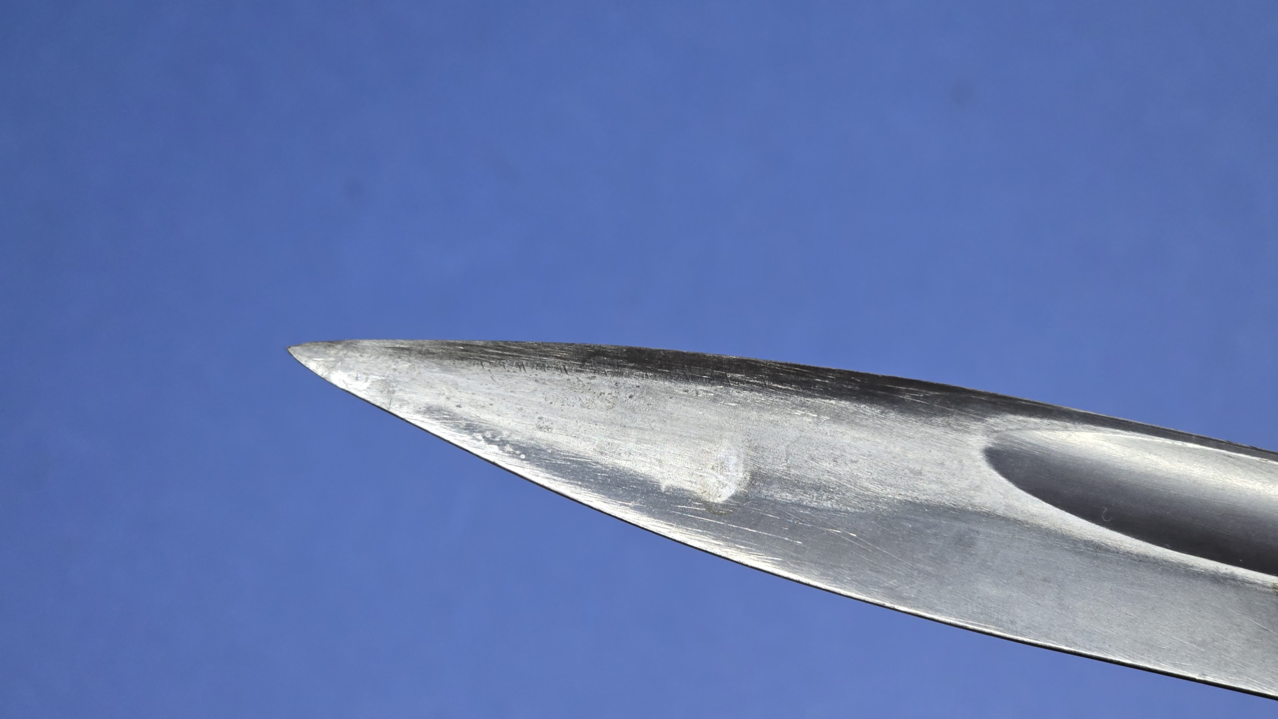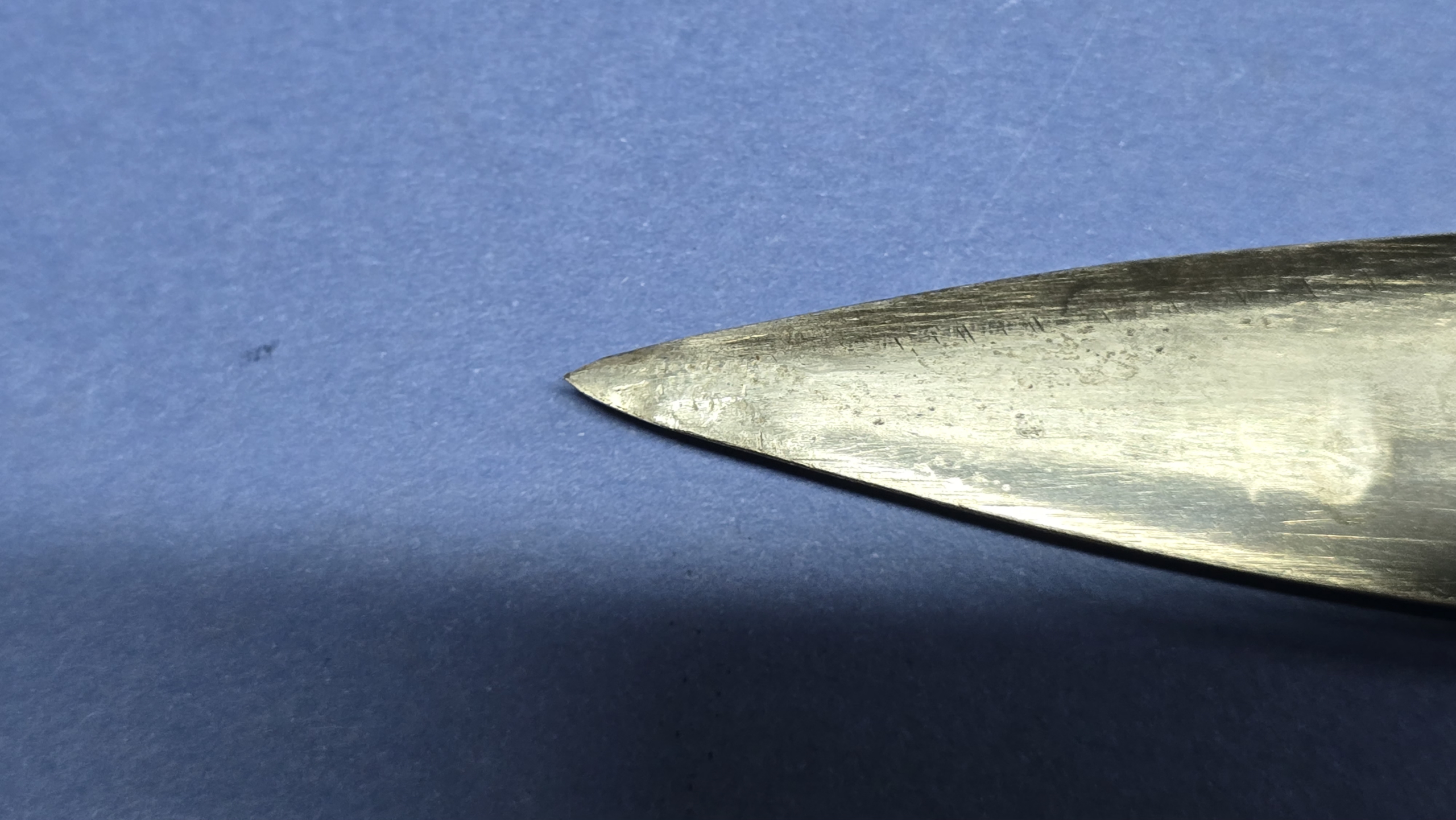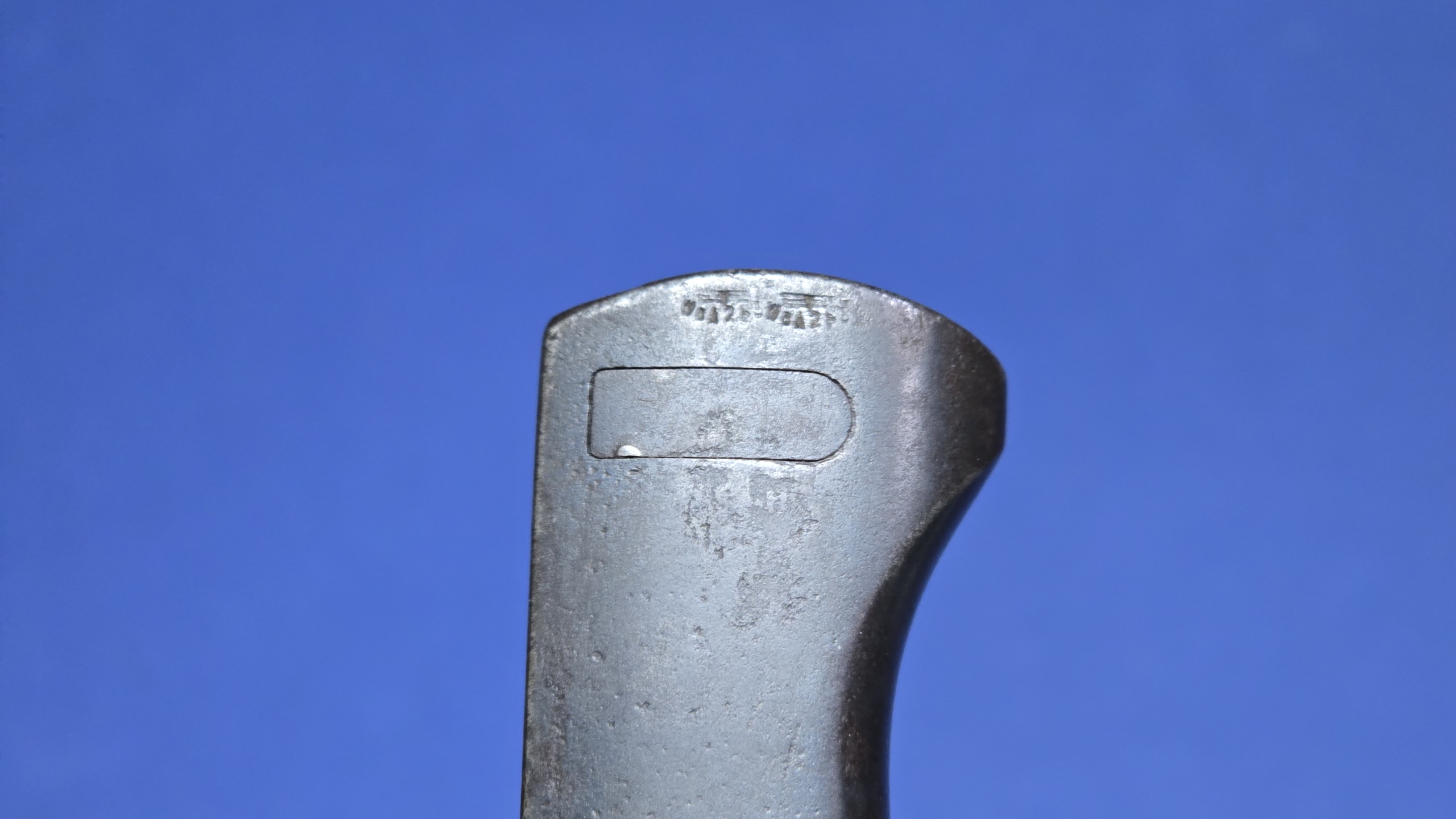 Unsharpened blade retaining most of its original bluing. The spine is dated 40 for 1940 production and the reverse ricasso is clearly marked E.u.F. Horster. Matching number 268 is present to the ricasso. There is visible staining in sections of the blade, primarily mid-blade. The staining is localised rather than across the entire surface, but even with the staining present, i’d still class the blade in very decent condition, and better than most.