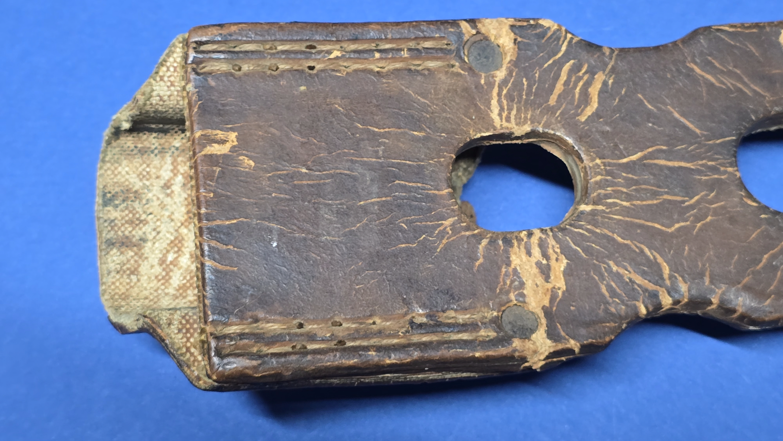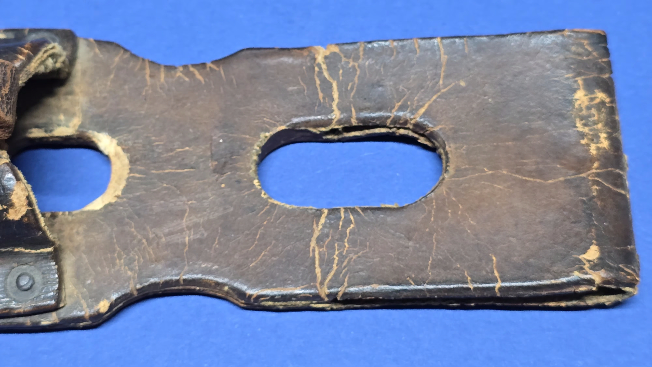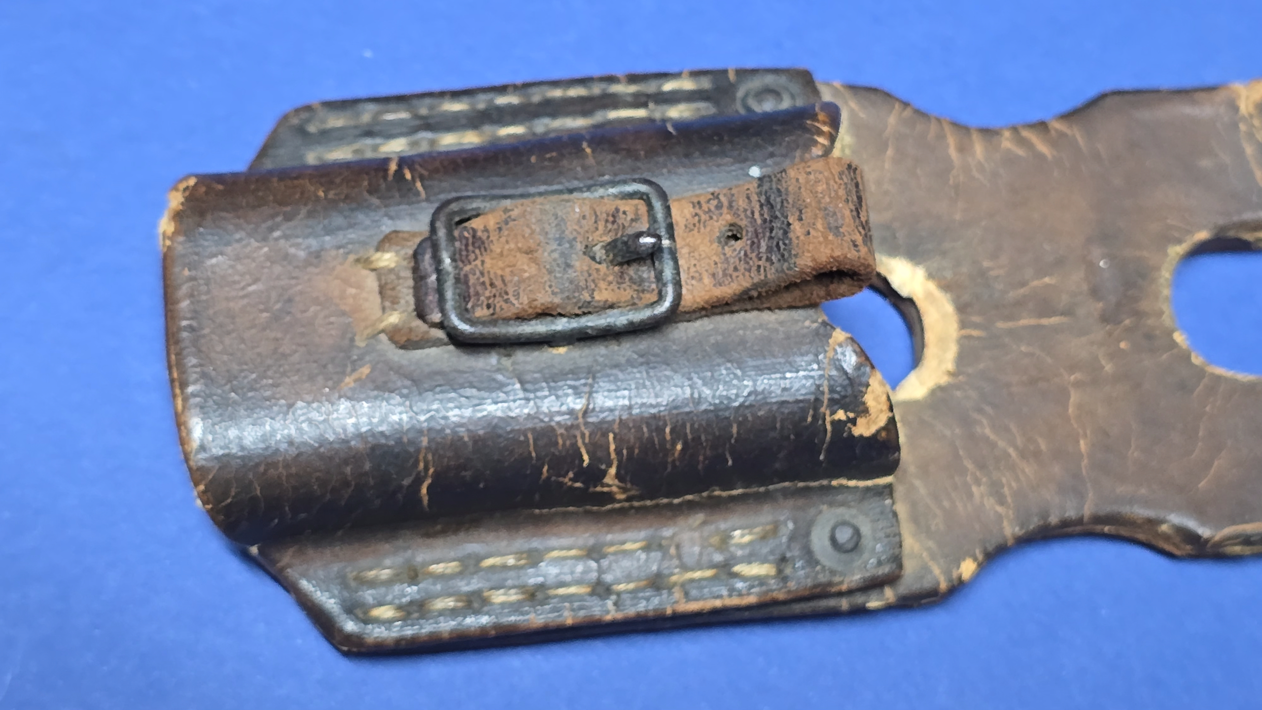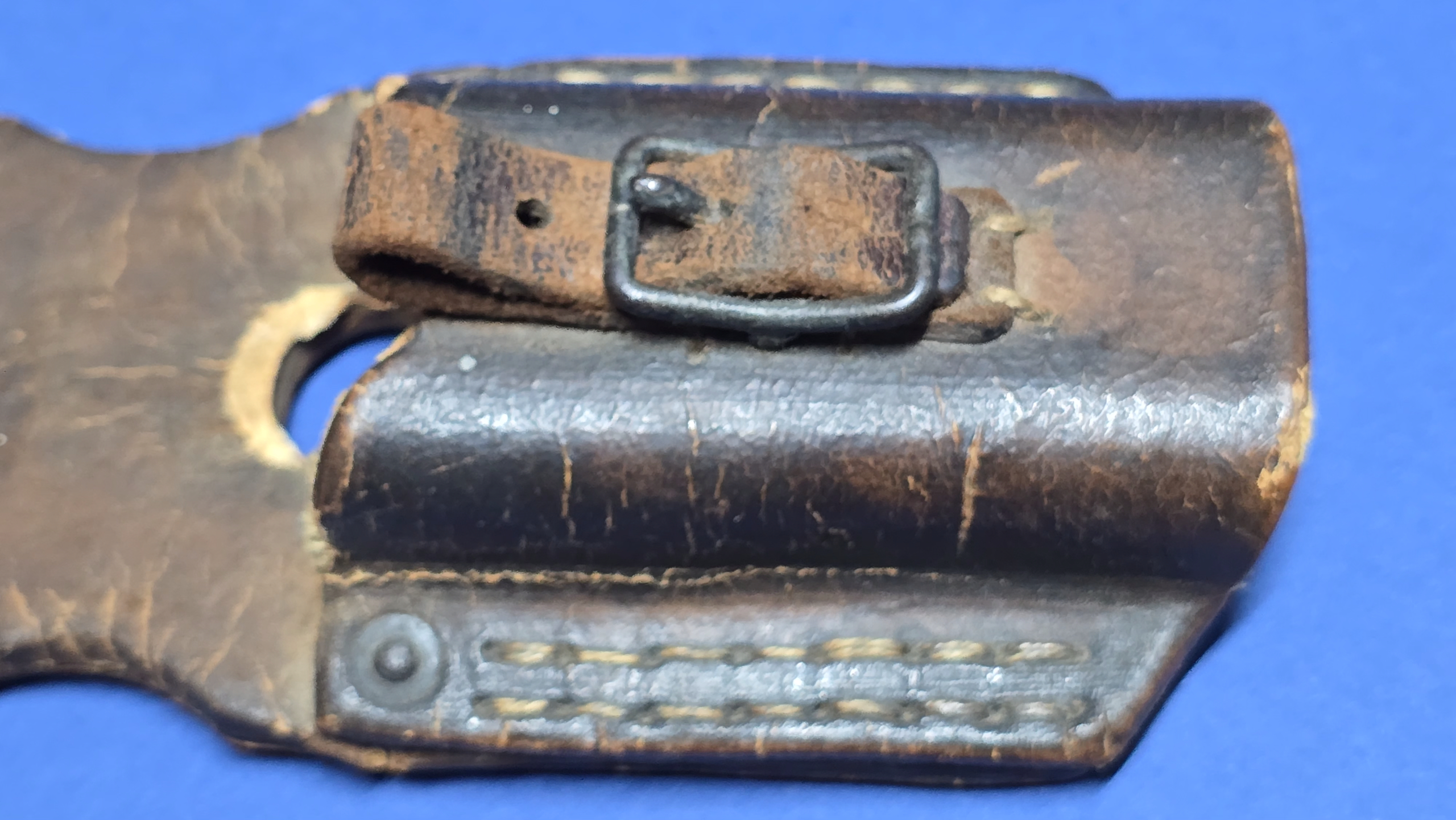 This frog is fitted with the correct square steel buckle, consistent with late-war manufacture. Internally, it retains canvas reinforcement at the throat and toe, a wartime measure used to stiffen the frog while reducing leather usage during periods of shortage.