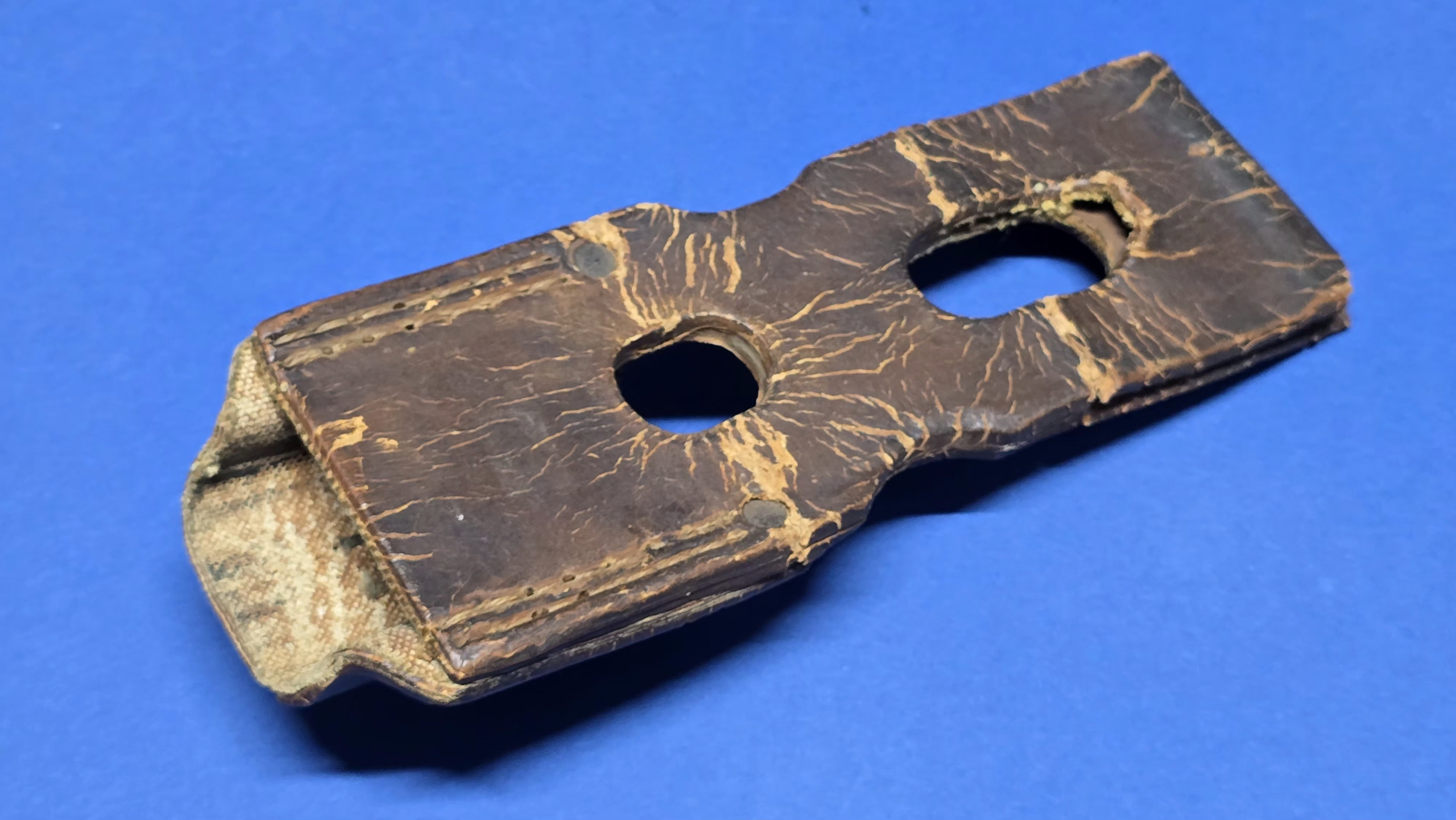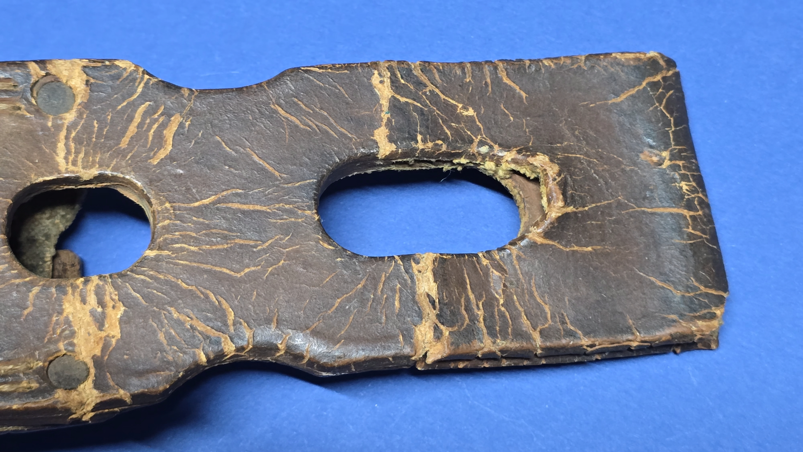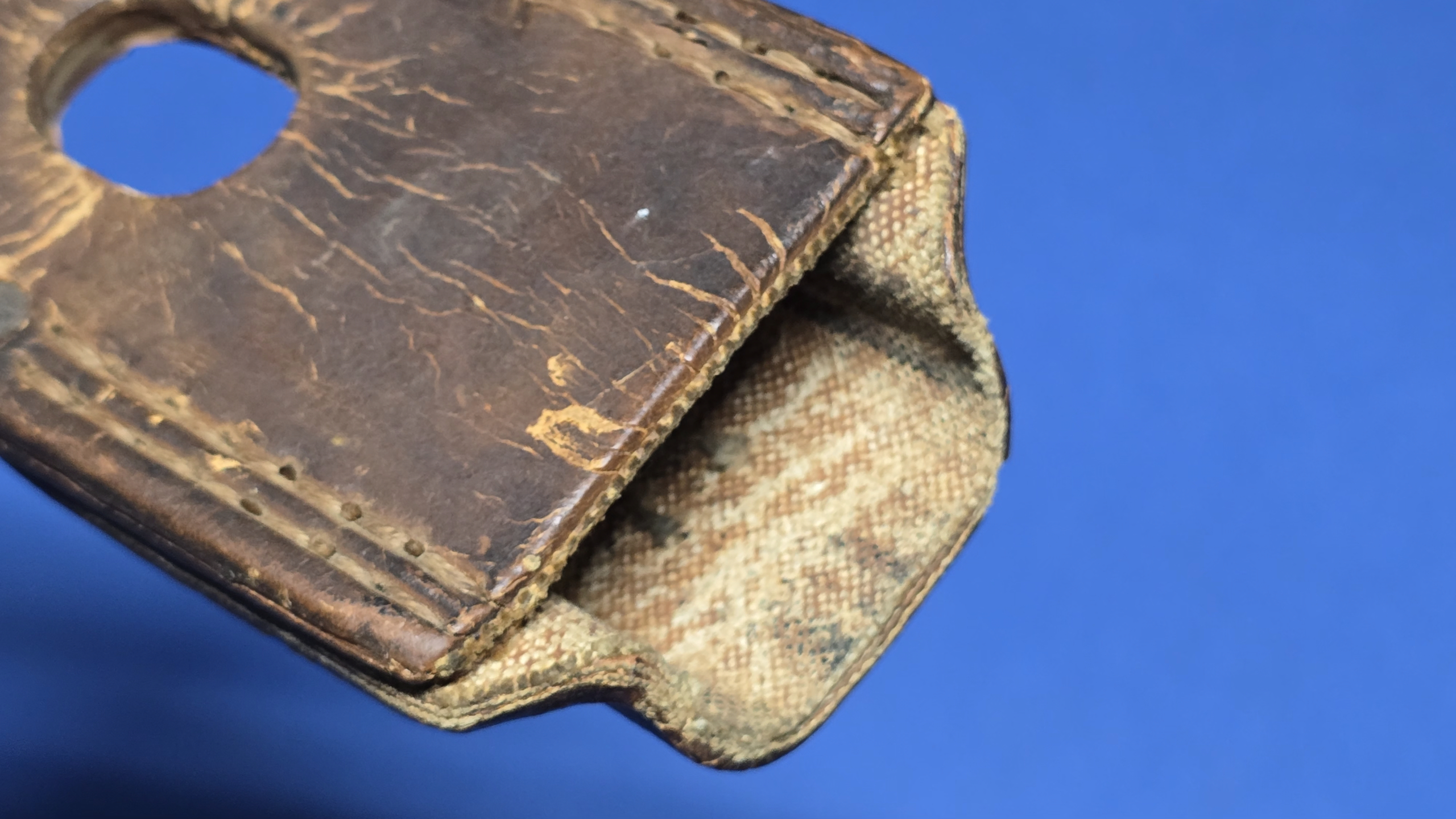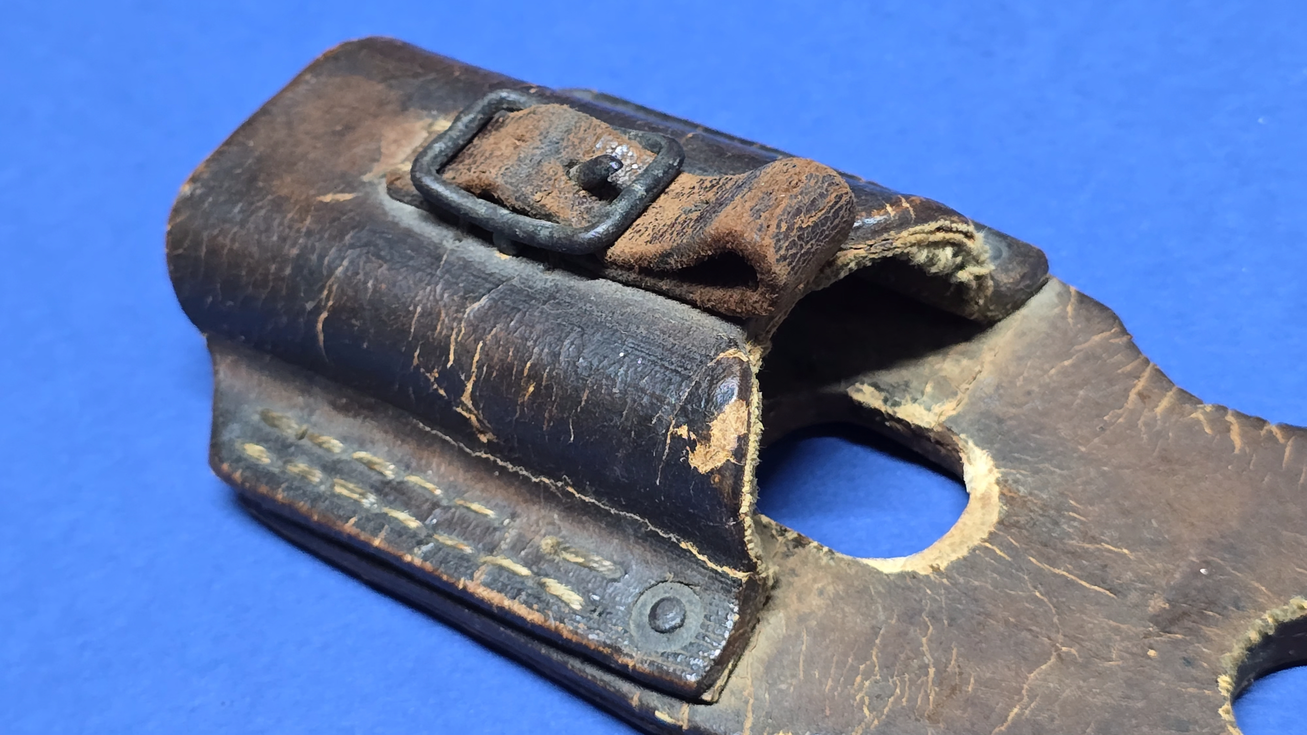 This frog is fitted with the correct square steel buckle, consistent with late-war manufacture. Internally, it retains canvas reinforcement at the throat and toe, a wartime measure used to stiffen the frog while reducing leather usage during periods of shortage.