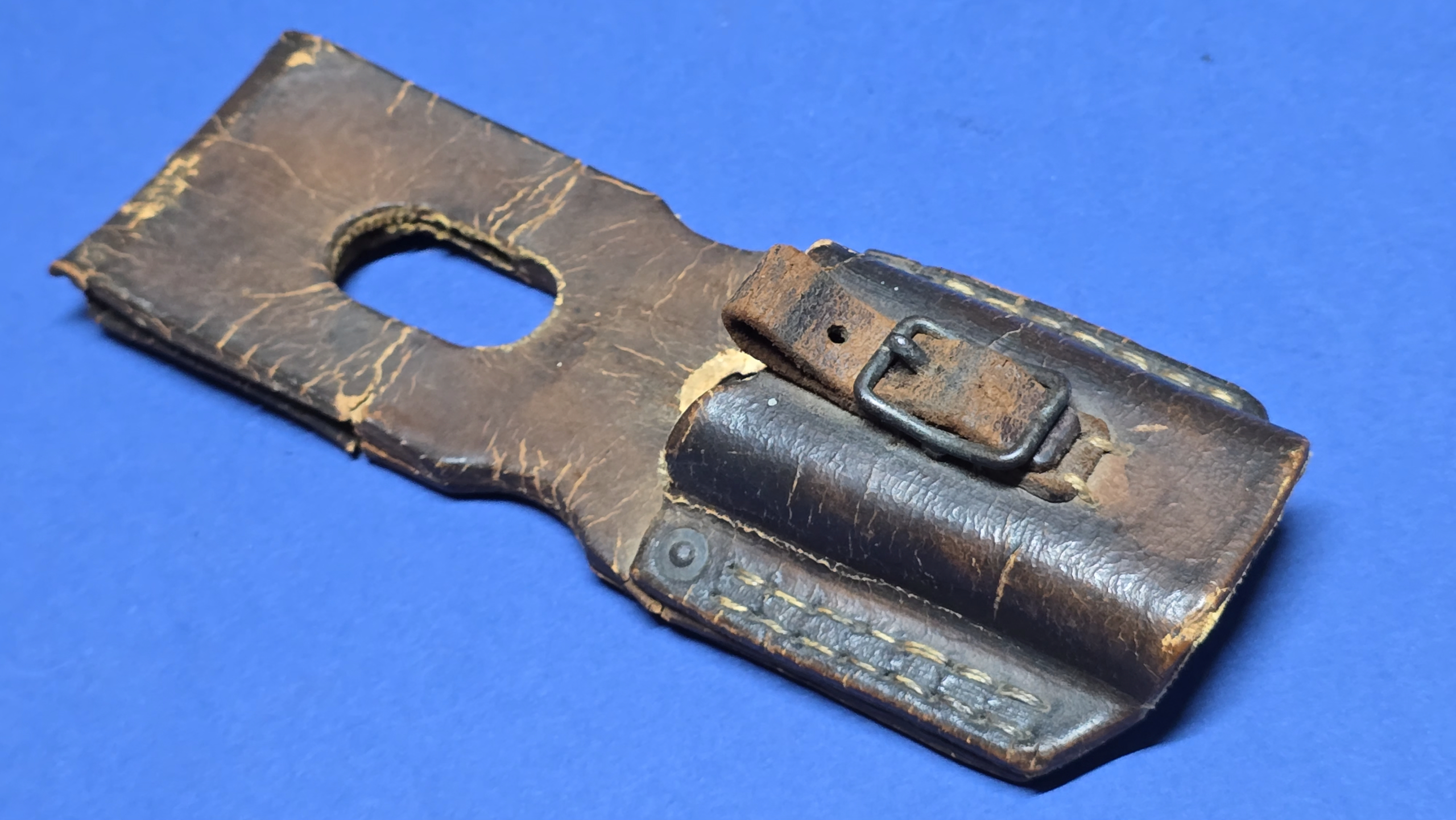 The steel buckle is original and securely fitted. Notably, the leather retaining tab at the buckle is fully present, intact, and functional — a genuine bonus, as this area is often found split or broken on late-war examples. All rivets are present, tight, and undisturbed.